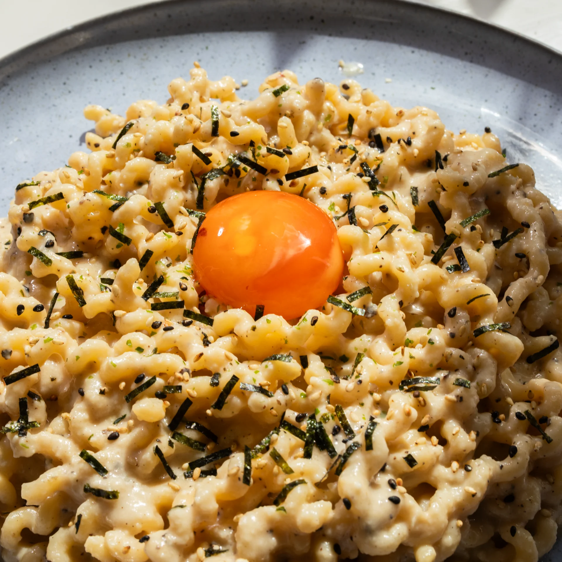 Mix well, and serve with a dusting of furikake, or nori flakes, and a cured egg yolk!