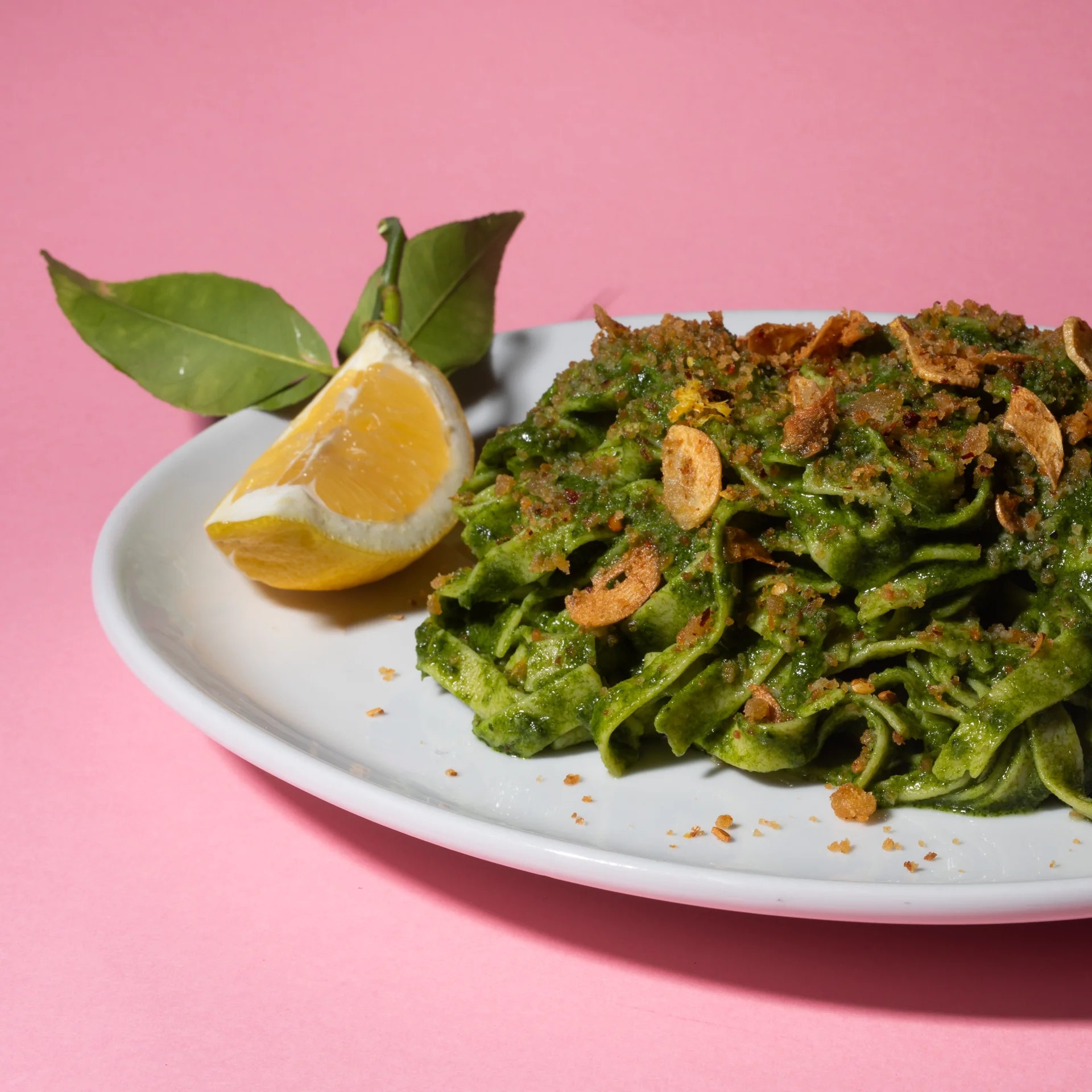 Cook pasta, a couple minutes less than instructed for al dente. Add the pasta to a warm pan, with a couple spoonfuls of the salsa verde, and a spoonful of the pasta water, warming everything through until the sauce is slightly thick and glossy. Finish with extra virgin olive oil, and plate, with our breadcrumbs and a wedge of lemon.