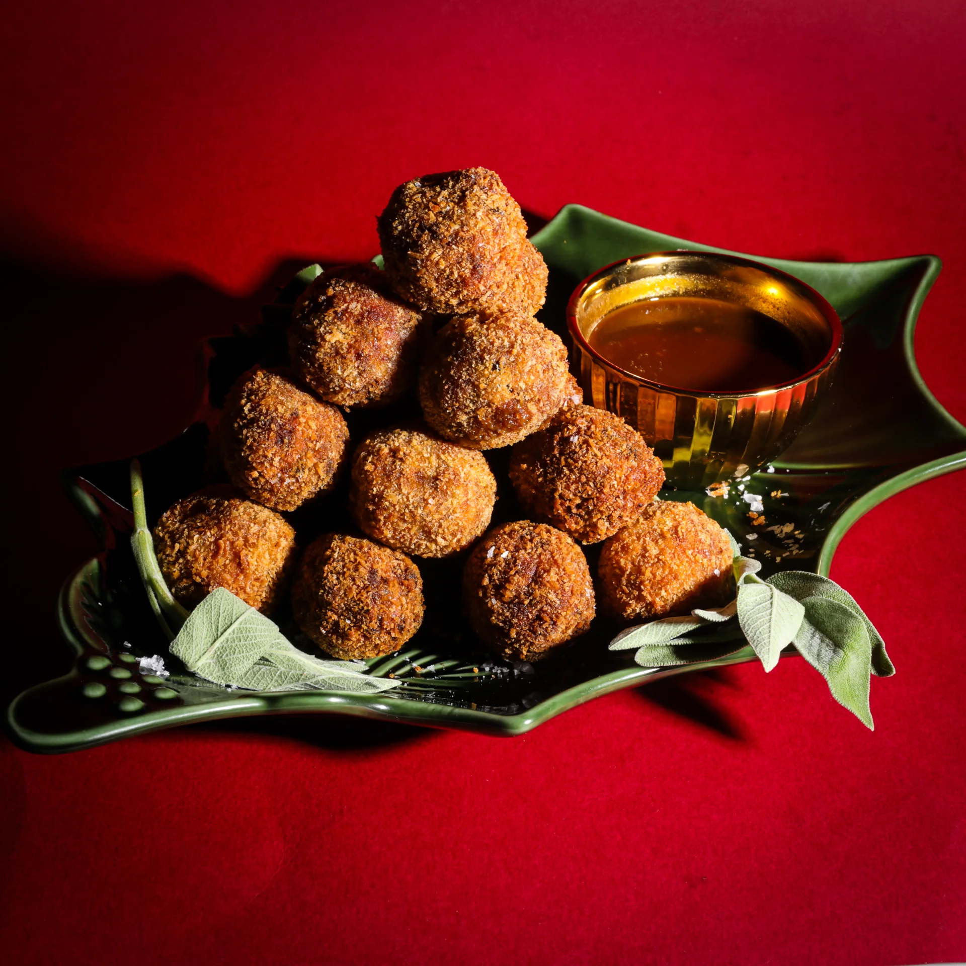 Fry the stuffing balls in batches of 6 or so, removing to a tray lined with paper towels then a wire cooling rack to stop them going soggy. Serve in a basket with the gravy on the side.