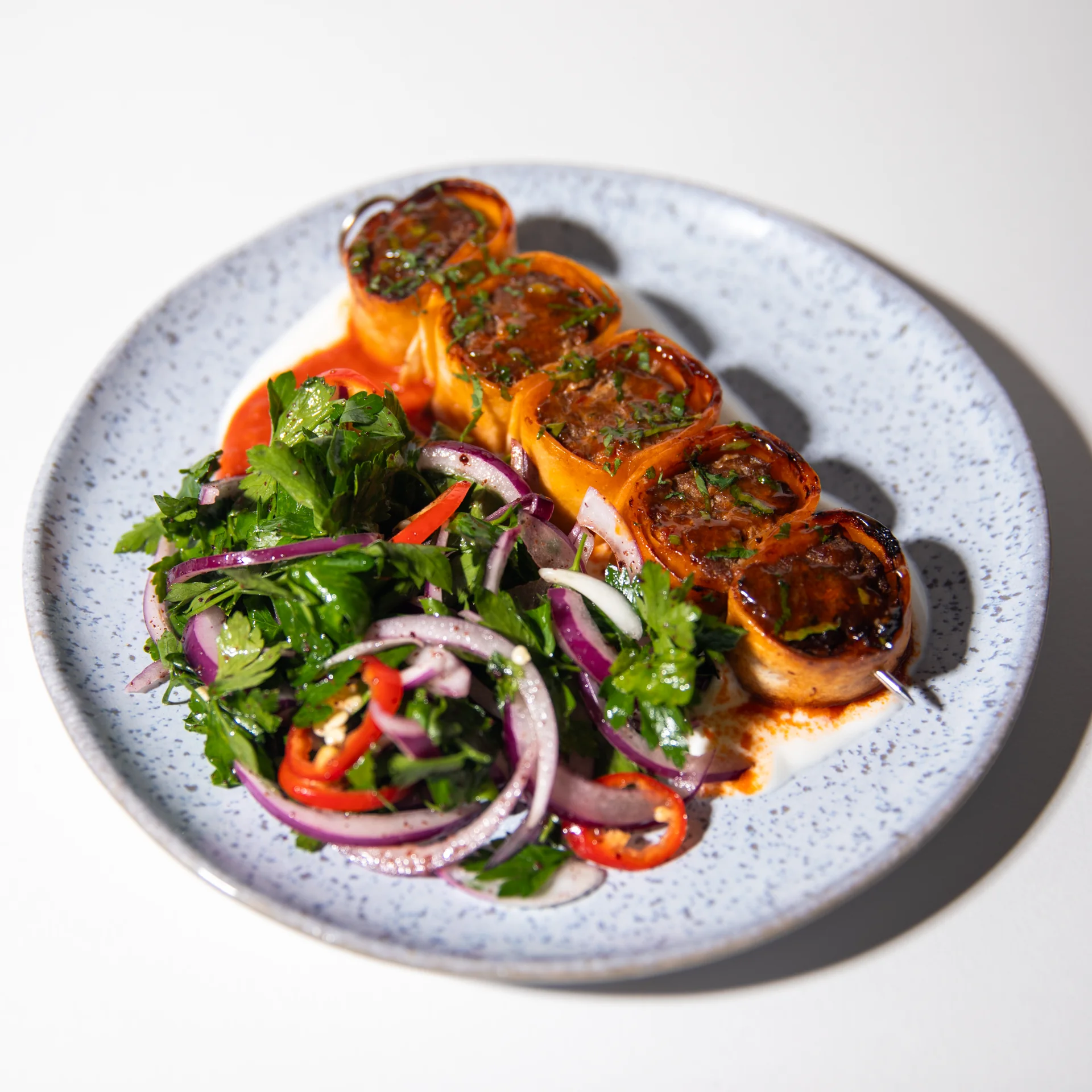 Once the kebabs have finished cooking, place onto a plate with our tomato sauce, some yogurt and a lemony salad, and enjoy!