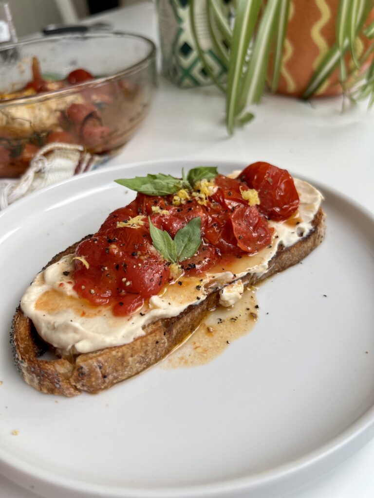 • Toast the sourdough then generously spread on the baked feta. Squash the tomatoes slightly then load them onto the toast. Drizzle over some of the cooking liquid and top with some lemon zest, basil leaves and black pepper. Devour and enjoy.