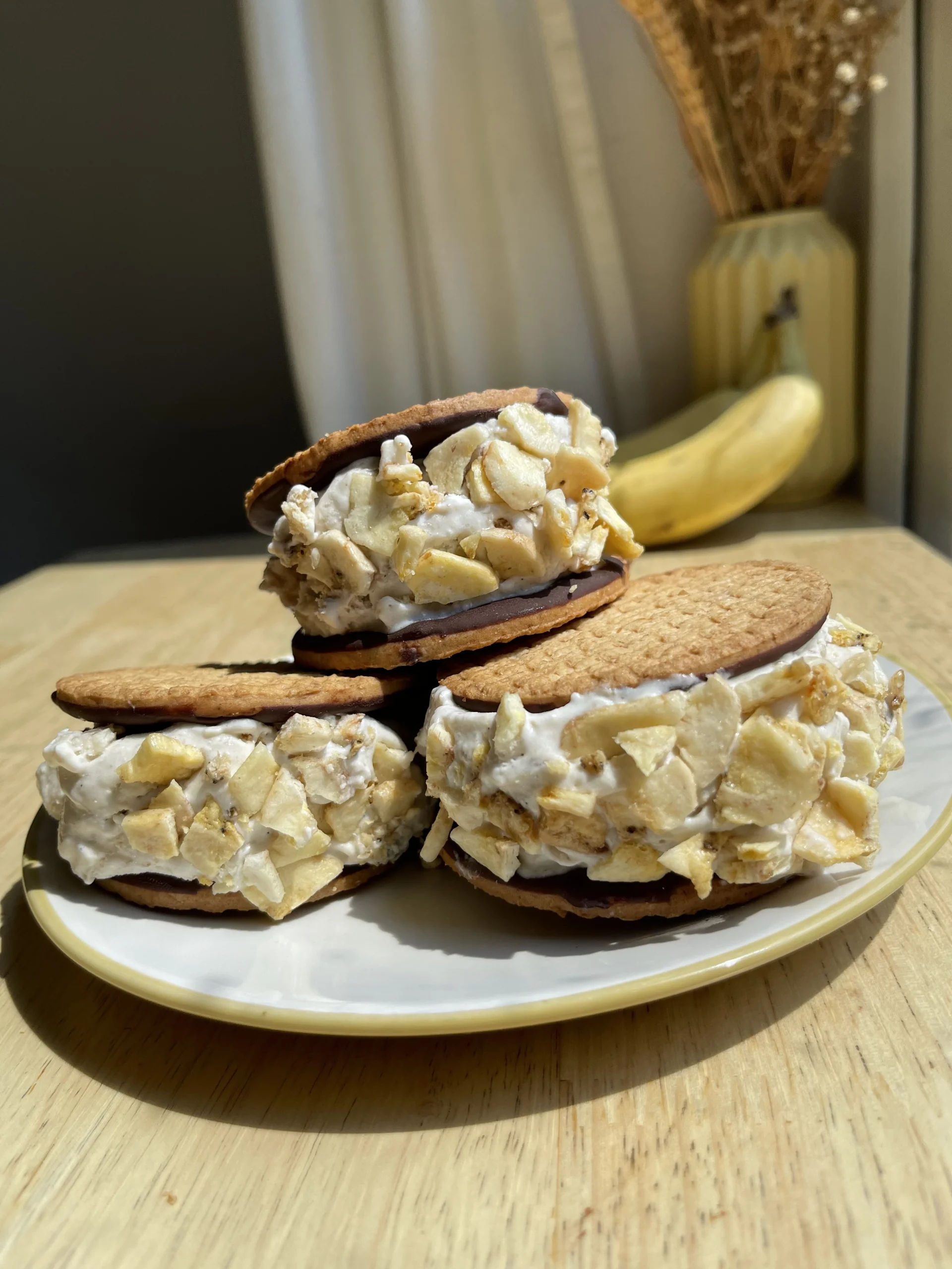 Once set, get a big scoop of ice cream and serve between 2 digestives. Roll one side in banana chips and press to ensure they stick. Serve immediately, or wrap and keep in the freezer to enjoy later!