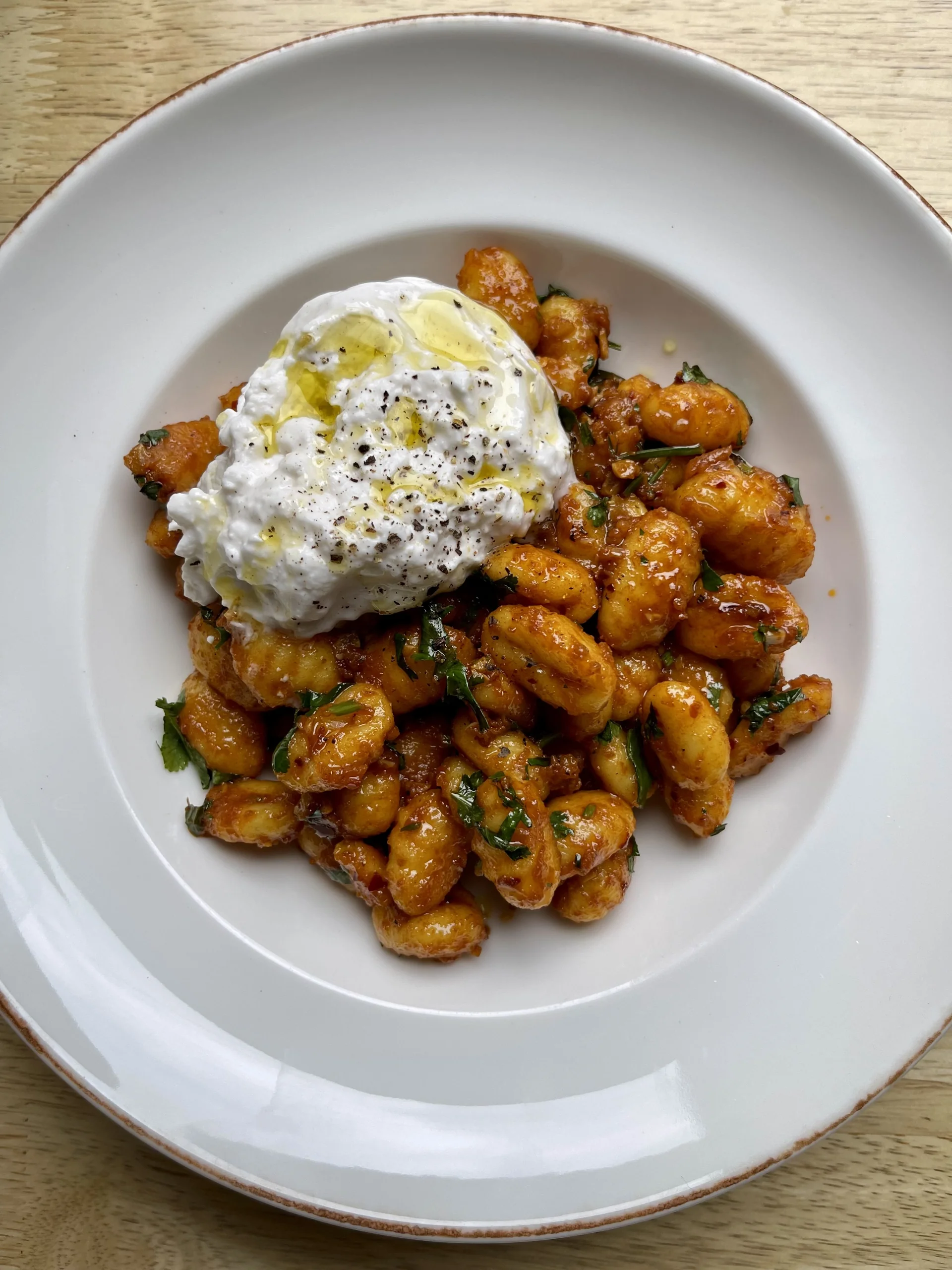 For such a simple meal this packs a real punch of flavour. This ones inspired by one of my favourite Lebanese dishes, Batata Harra, crispy potatoes fried with paprika, garlic, lemon and coriander. This one uses gnocchi to make it a complete meal and tomato puree for even more depth and umami.