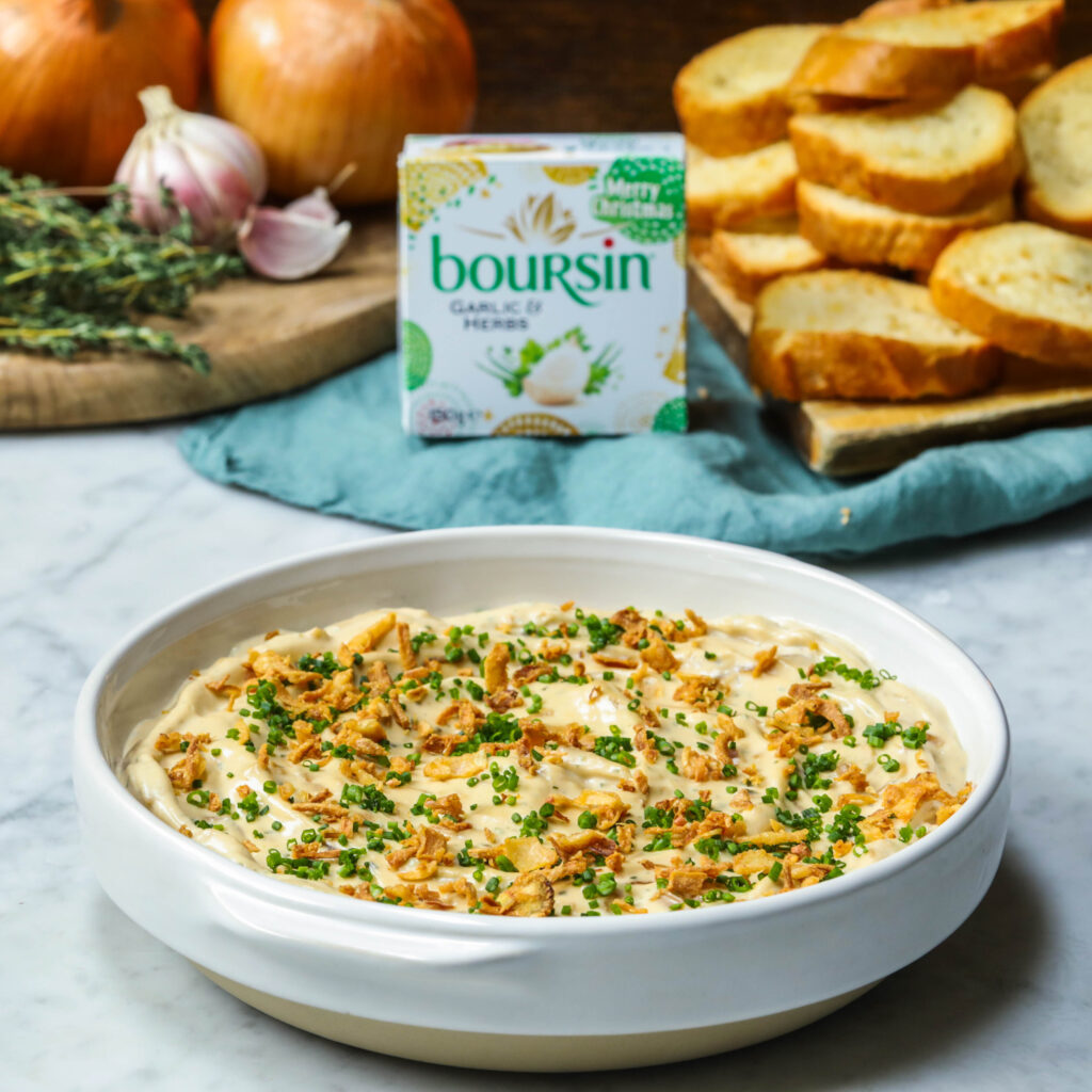 Everyone has a Boursin in the fridge at Christmas, don’t they? Why not turn it into a delicious French Onion dip to share with guests over the holidays?