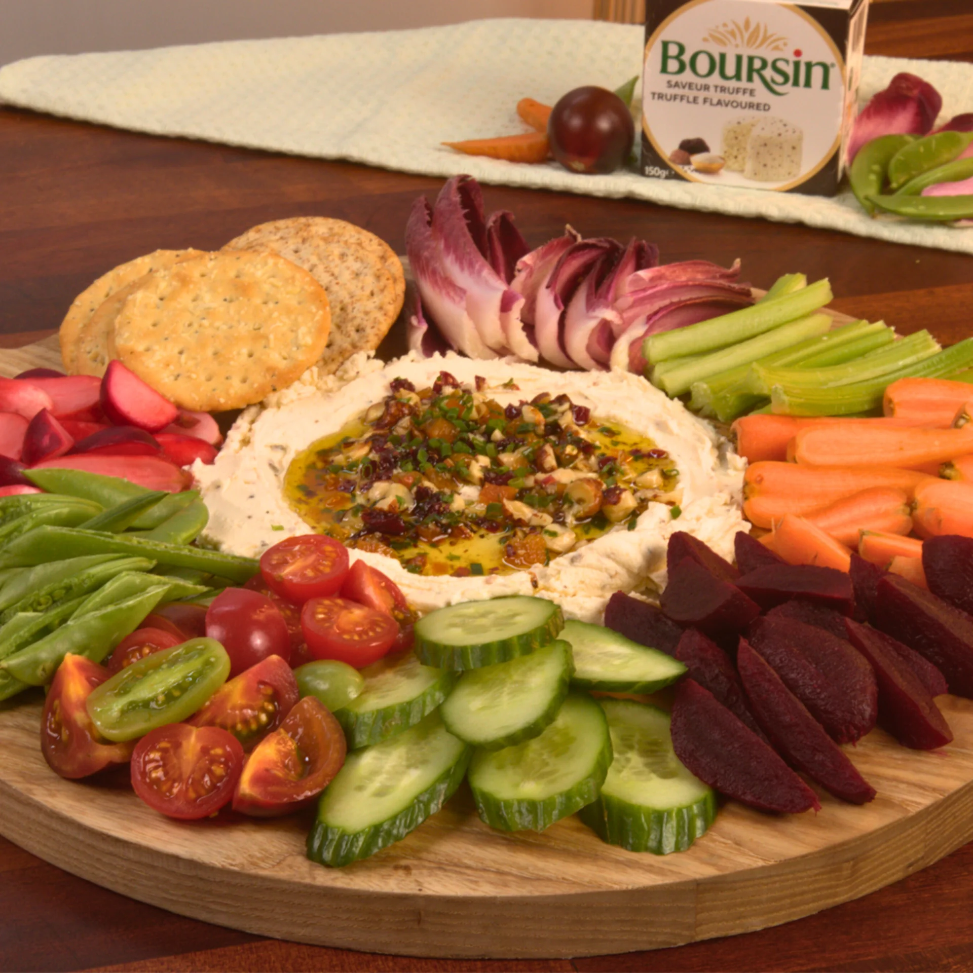 Everyone's loving bread dipping oils, so we're loading it onto Boursin truffle and serving with crudités for a deliciously light sharing board!