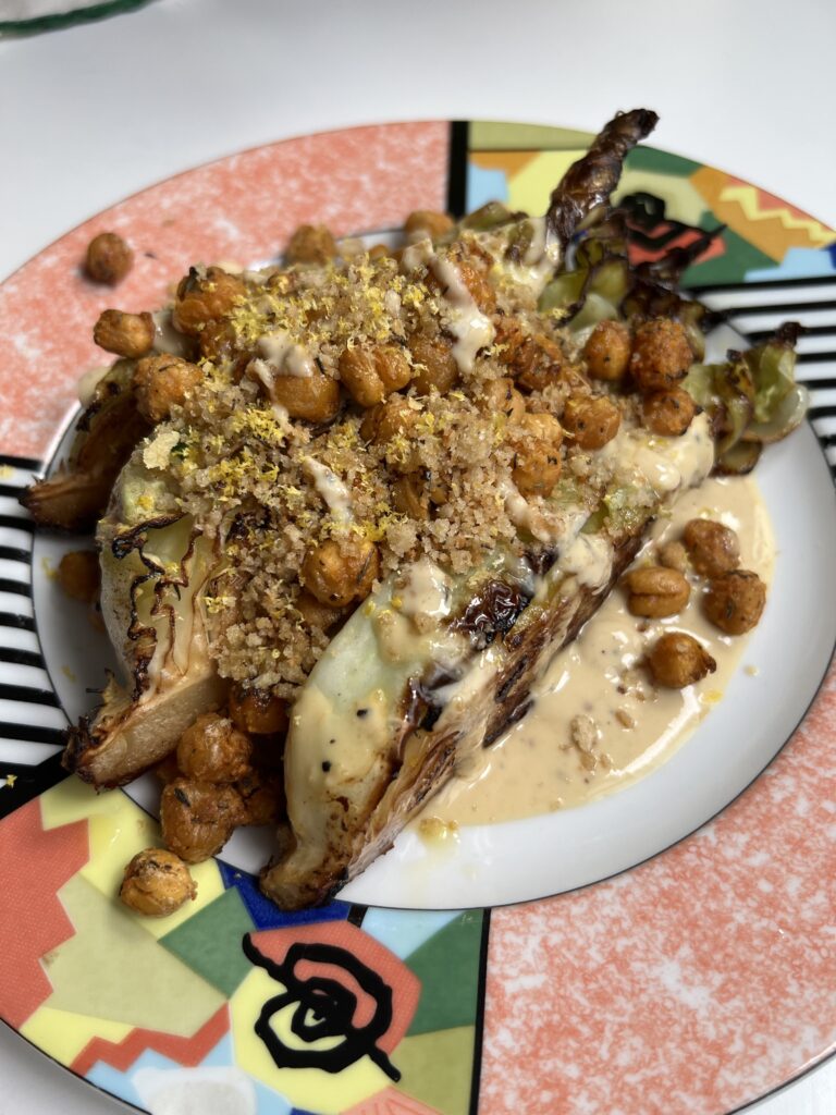 Spoon some of the dressing onto a plate then top with the charred cabbage, crispy chickpeas, breadcrumbs and some lemon zest. Squeeze over some lemon juice and tuck in! Serve with extra bread to mop up the sauce at the end.