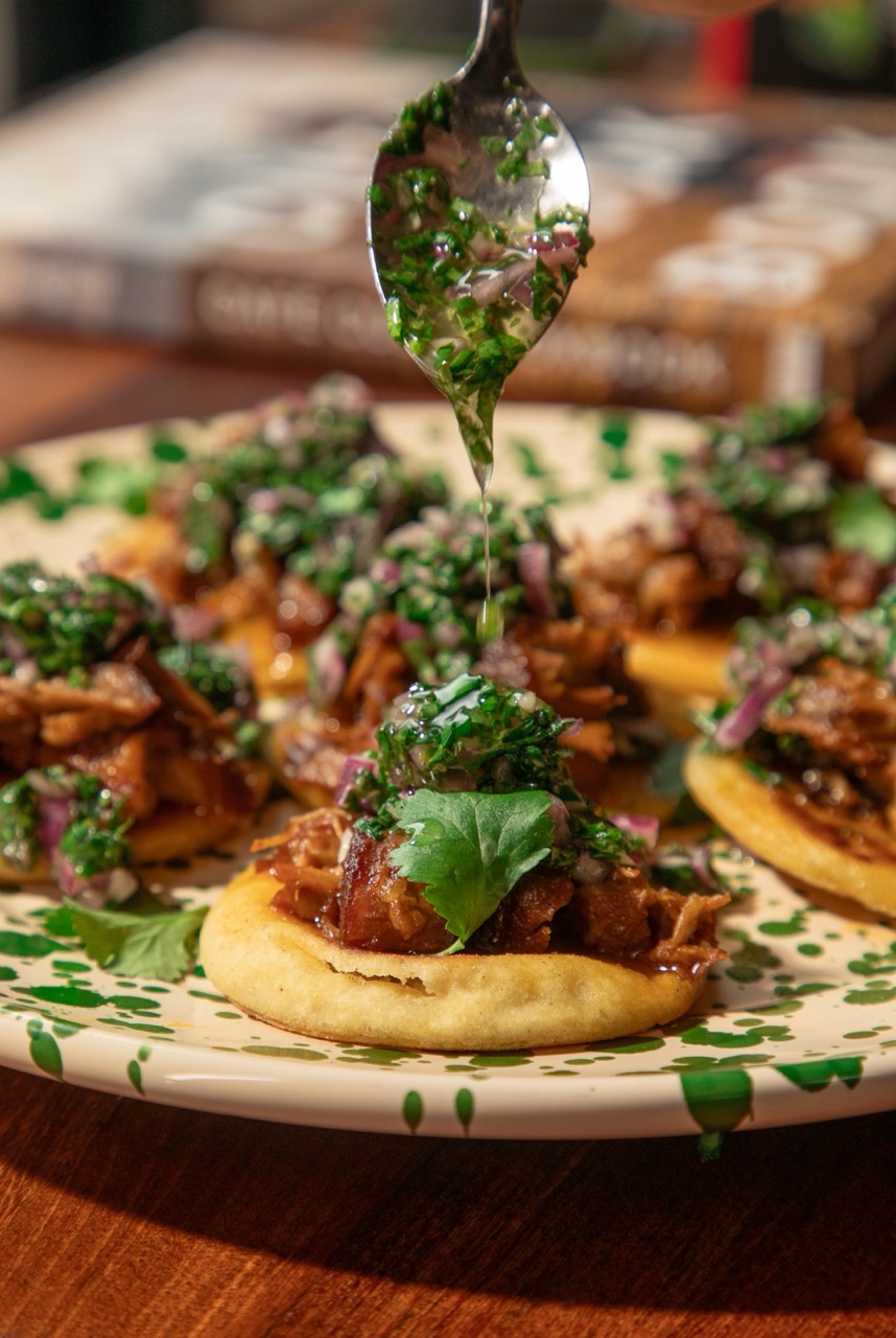 Place the tattie scones on a plate and with a pair of tongs, pop a generous helping of pulled pork on each taco, then finish with a drizzle of chimichurri and fresh coriander leaves.