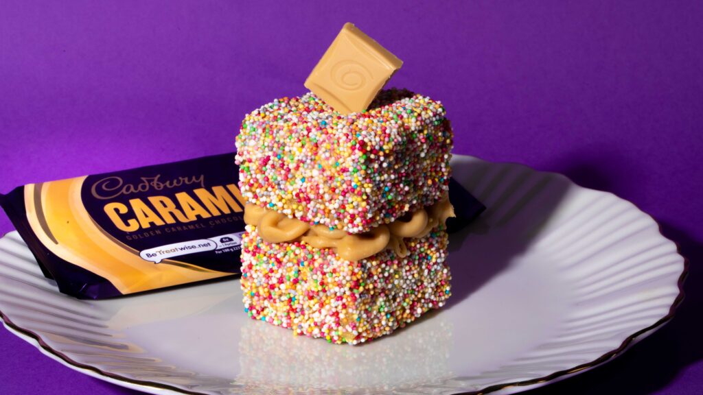 Spread a thin layer of melted caramilk over two squares, then roll the squares, one at a time, in hundreds and thousands so they’re completely covered. Once both squares are covered, pipe a thick layer of ganache in between them. Repeat with the remaining squares, and enjoy!