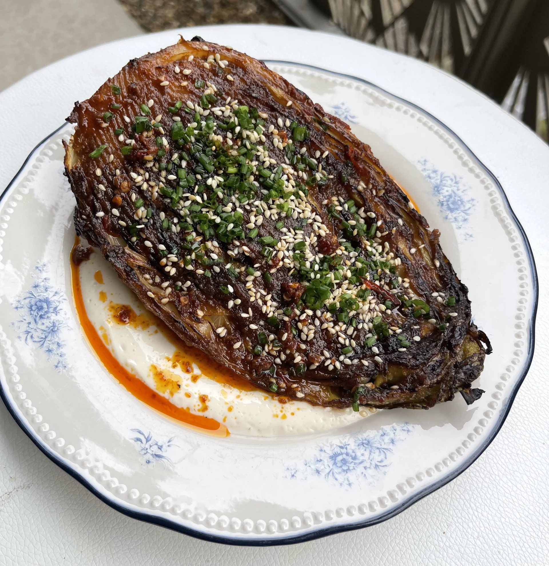 Garnish the cabbage halves with plenty of sesame seeds, chopped chives and chilli oil. Serve with rice or on the tofu sauce to provide some creaminess to cut through the rich sauce. Enjoy!
