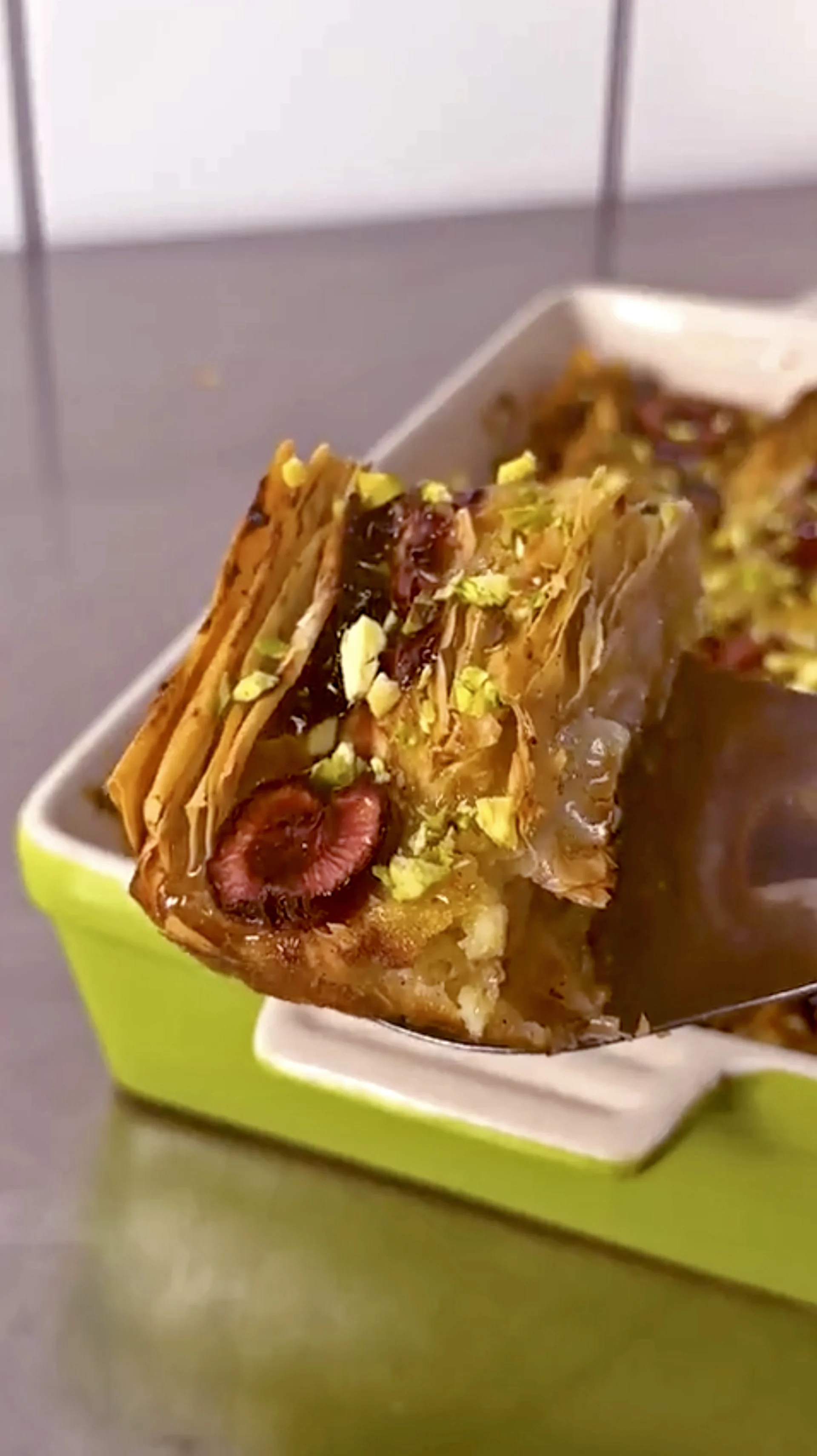 When baked, take out and pour over a sugar syrup*, then optionally top with a sprinkling of crushed pistachios.