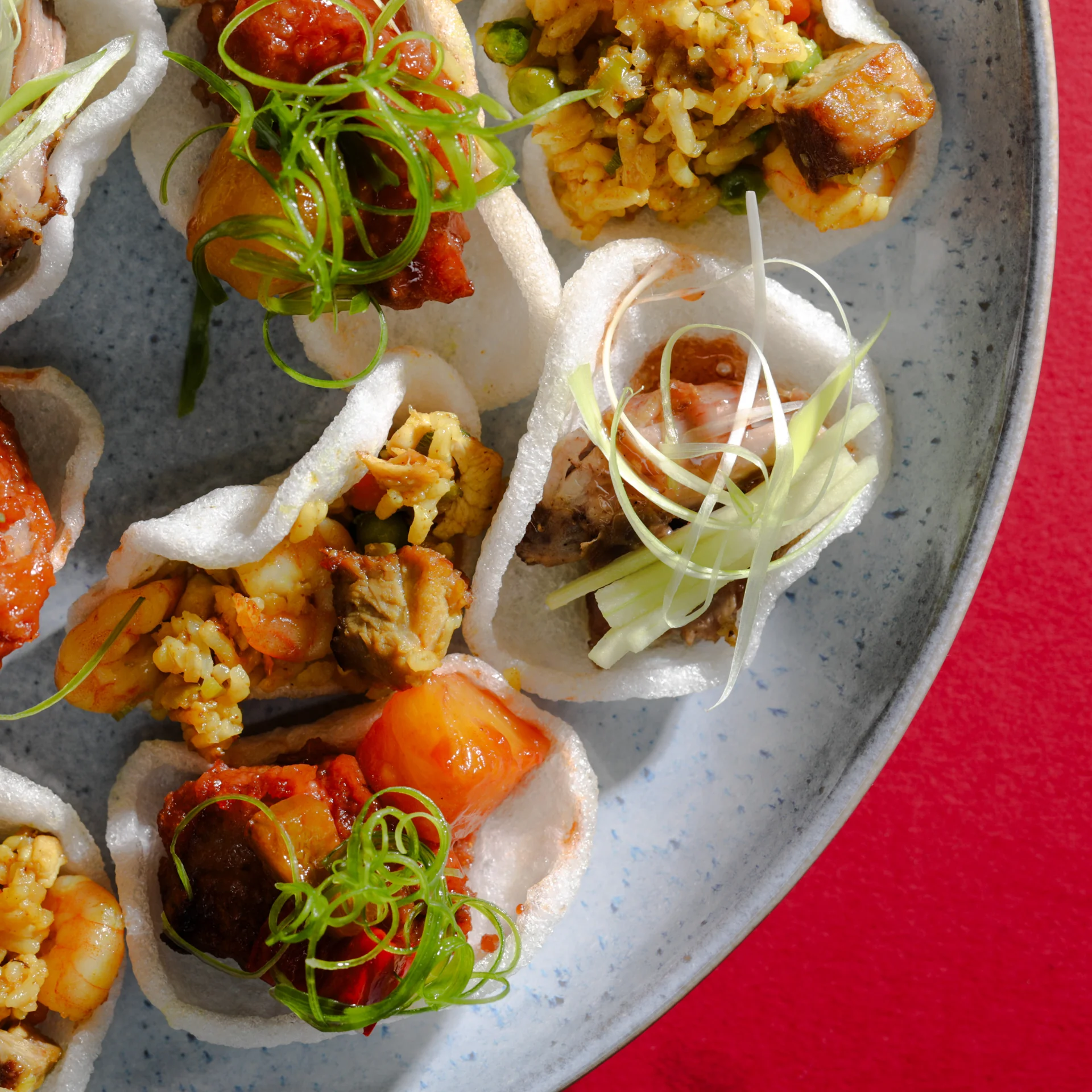 Start with the rice! Place a wok on high heat with vegetable oil, and start adding in the aromatics, followed by the meats and seafood. Follow in with your veggies, and rice, finishing off with the spices and sauces. Season to taste and what you're left with is a deliciously vibrant rice, ready for your canapés!