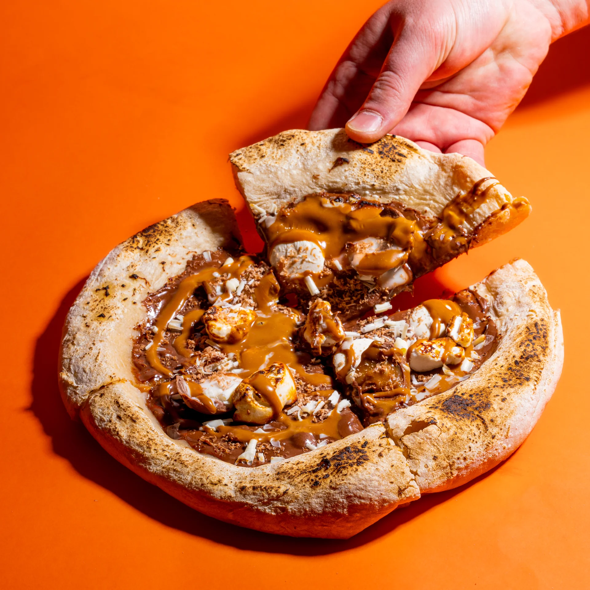 Fluffy pizza dough, chocolate hazelnut spread, toasted marshmallows, creme eggs and cookie butter. Heaven!