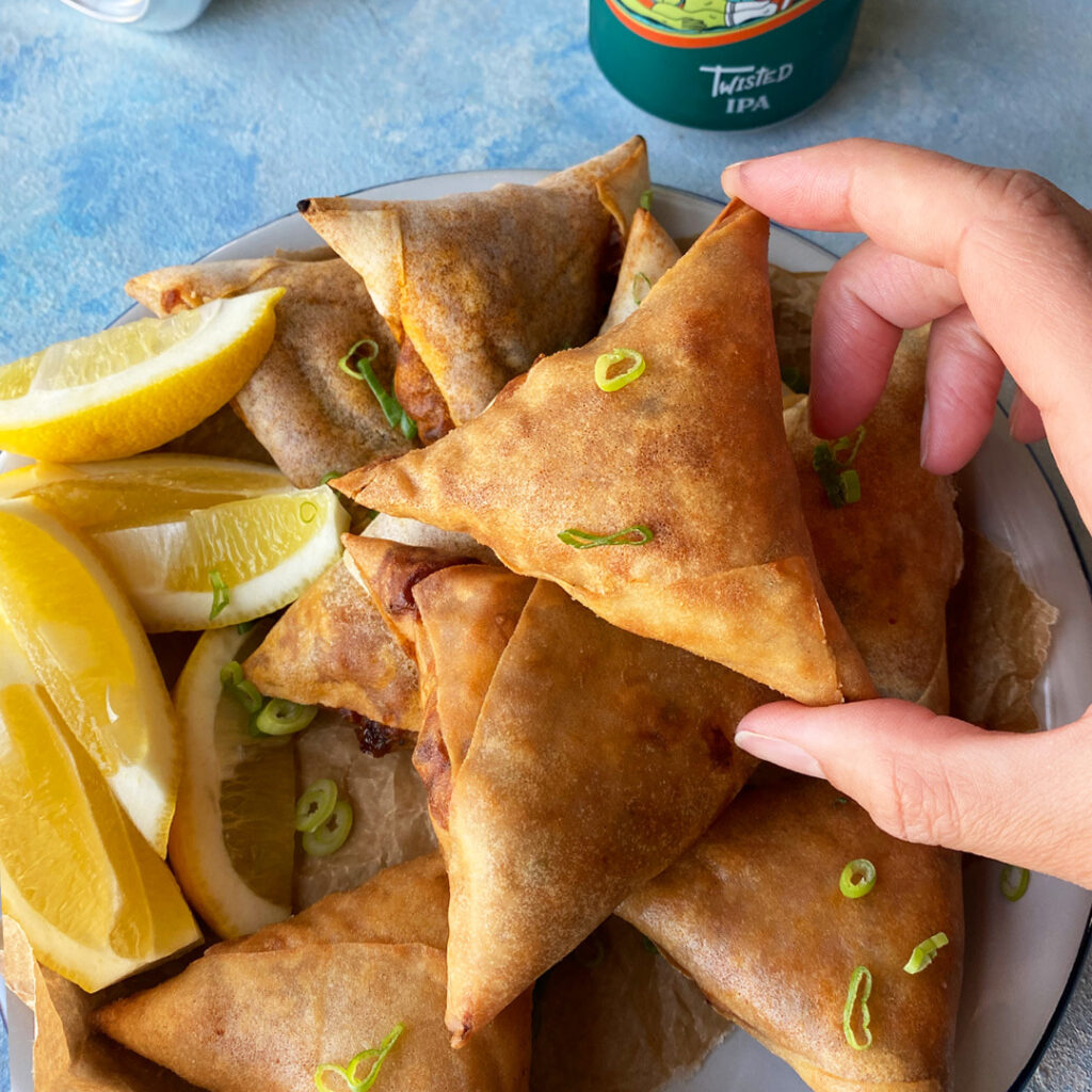 Meanwhile, heat your oil to 170ºC. When hot, fry the samosas until golden brown! Or alternatively, spray with oil and airfry at 180ºC for 18 minutes, flipping halfway through.