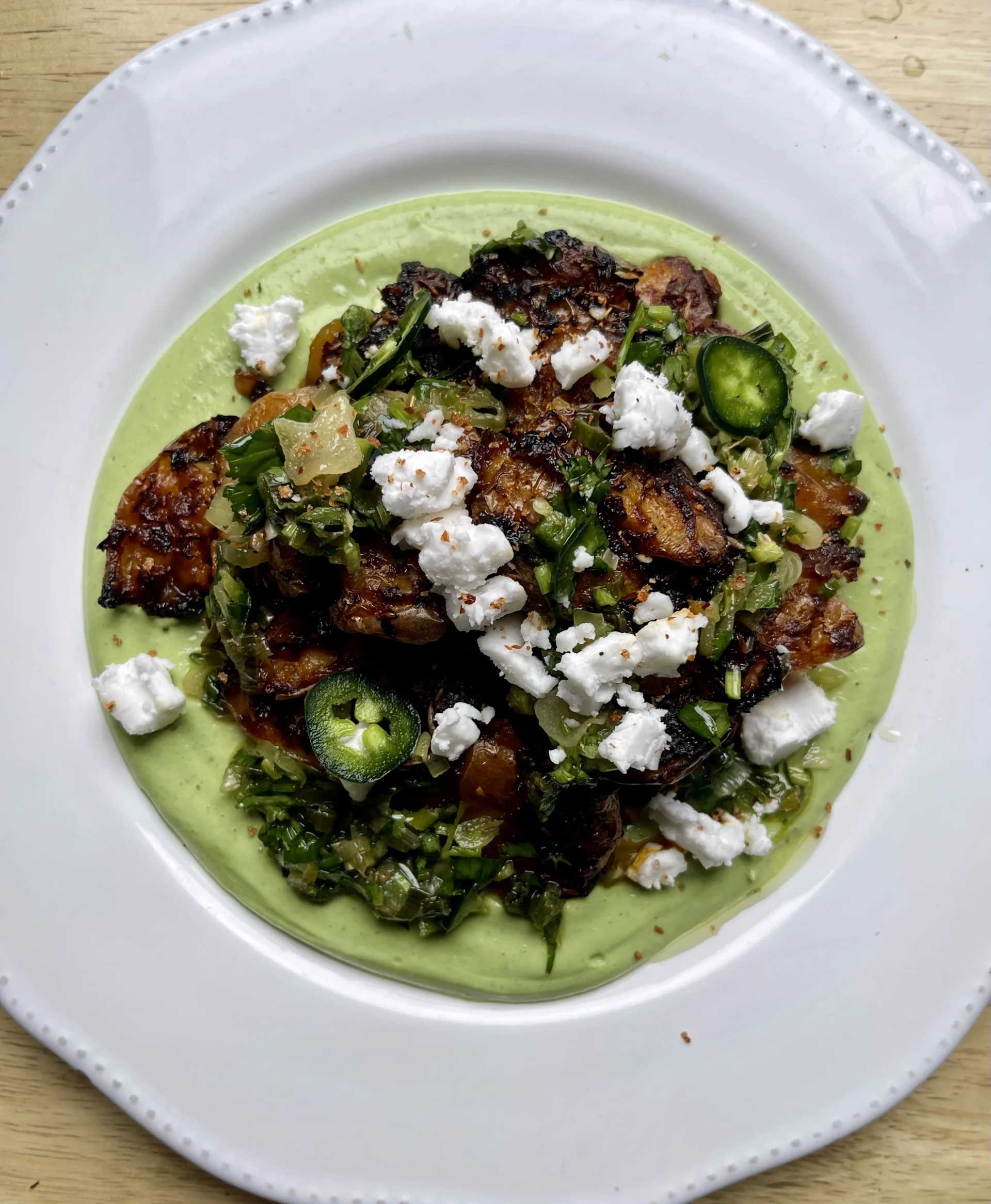 Allow the potatoes to cool after roasting then plate up smoothing the yoghurt down on the plate first, loading on the potatoes and drizzling with plenty of the spring onion and garlic oil.