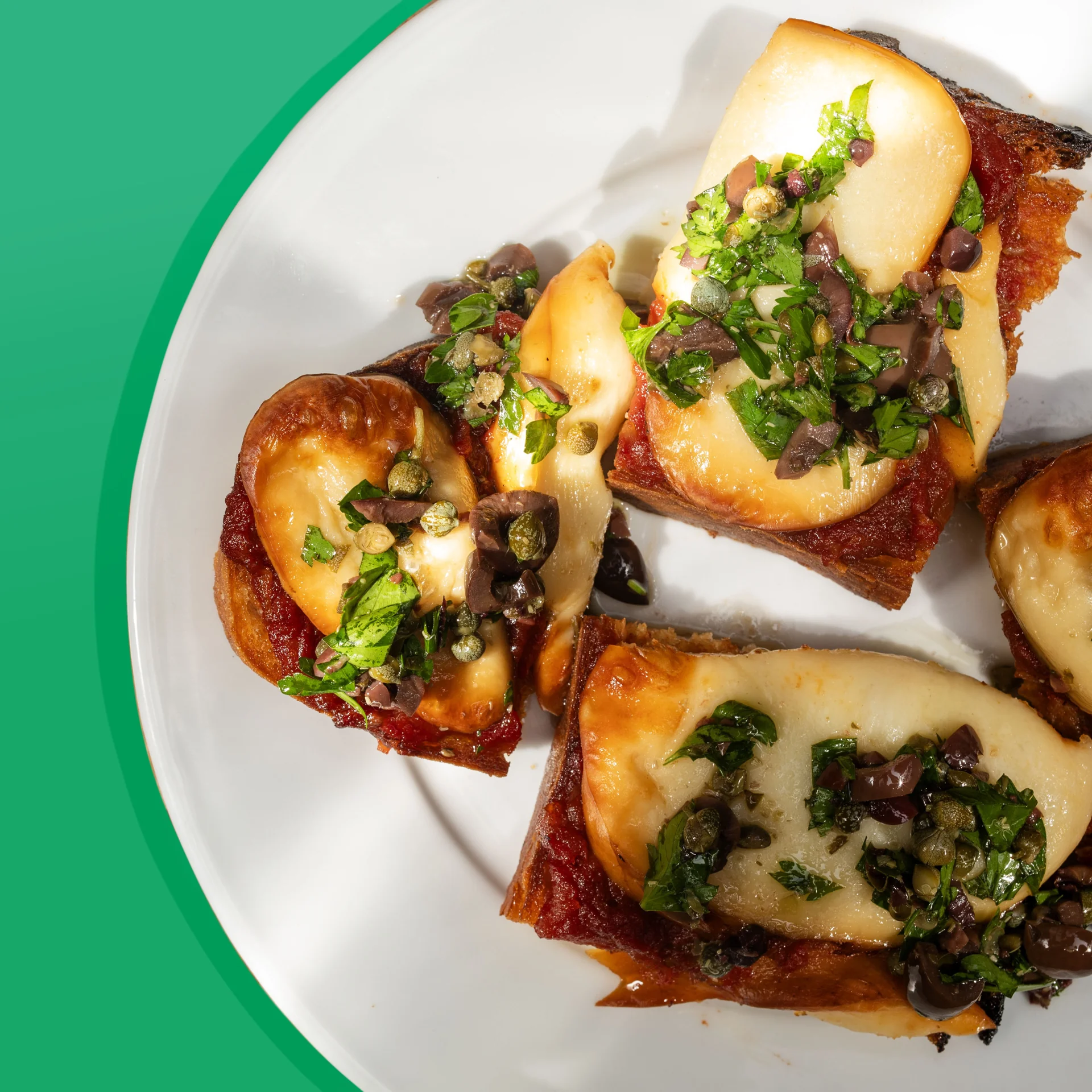 Think of this as a hybrid between a bruschetta and pizza, with a beautiful fresh olive and caper dressing.