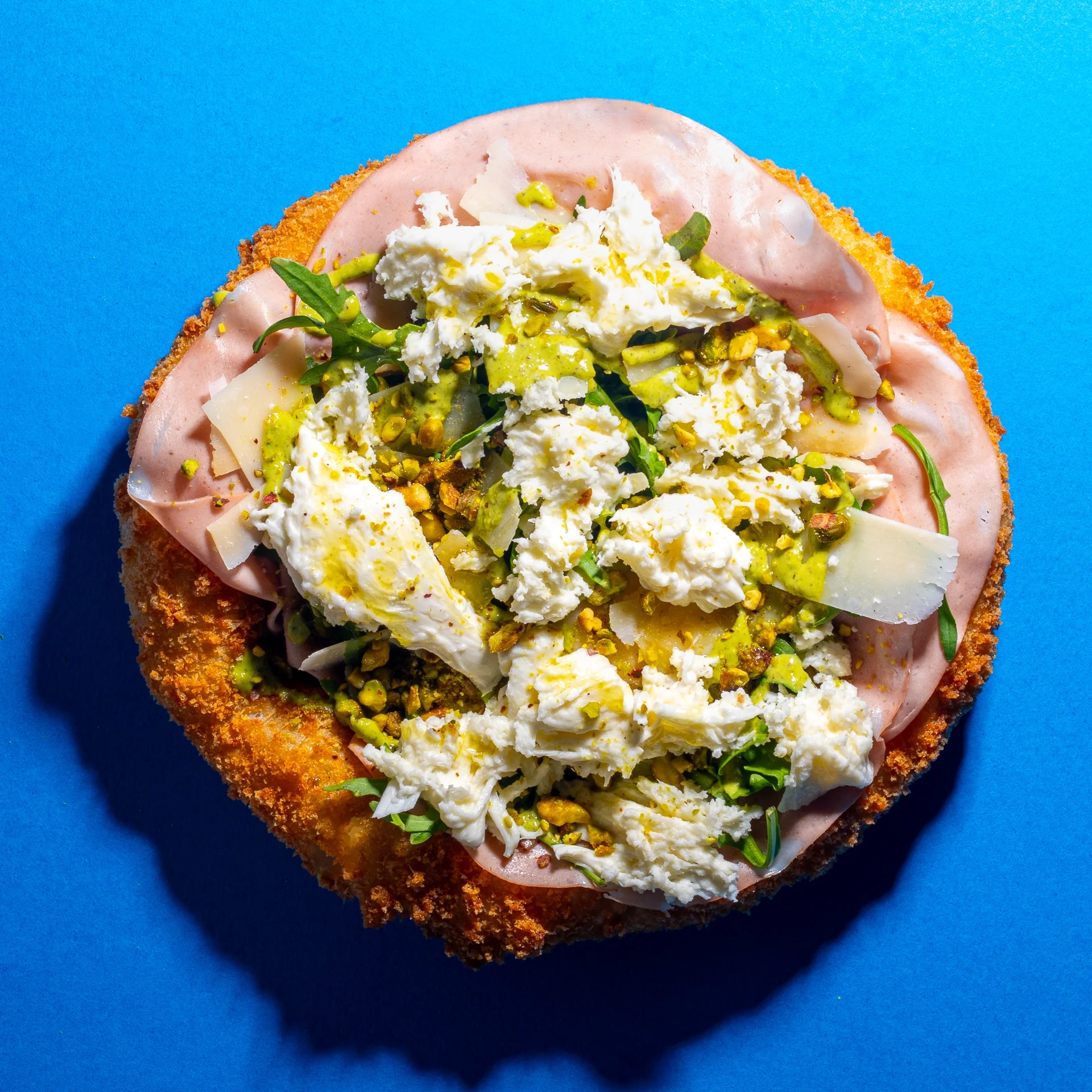Introducing our new obsession, the Panne Pizza - inspired by a pizza fritta (from Naples), and a breaded cutlet from the north (Lombardi), this pizza dough is covered in breadcrumbs, deep fried, and topped with fresh mozzarella and rich pistachio pesto! Just delicious!