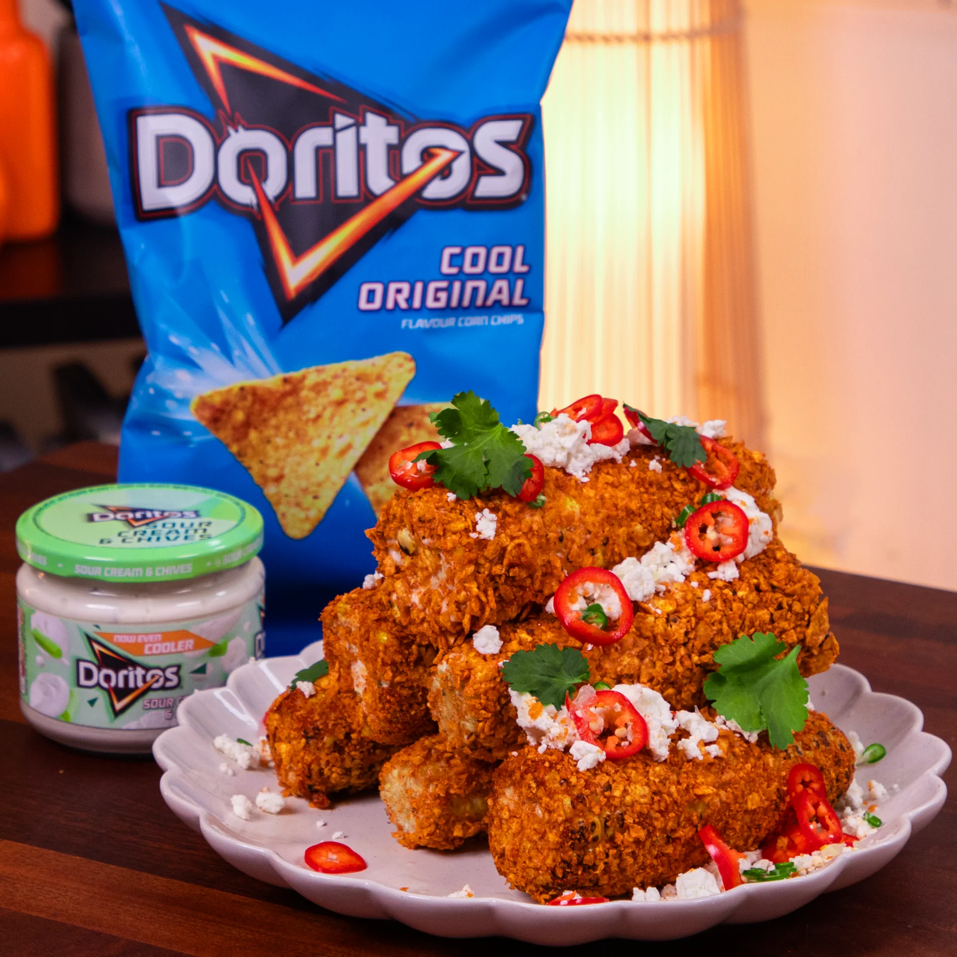 Brush the corn with Doritos Sour Cream and Chive Dip, before dropping them into the bag of crushed Doritos and shaking till completely covered.