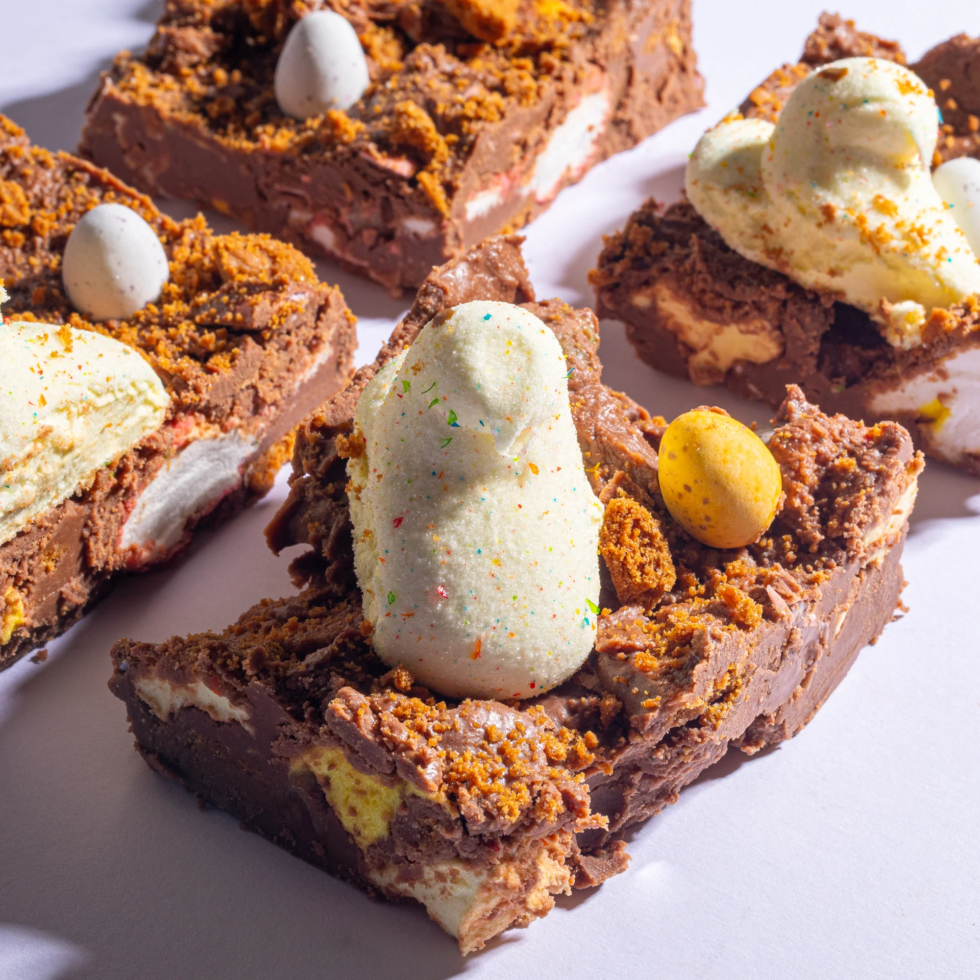 Indulgent soft chocolate, with a touch of salt, and mixed with crushed Lotus Biscoff, mini-eggs, and Peeps, because they're so cute!