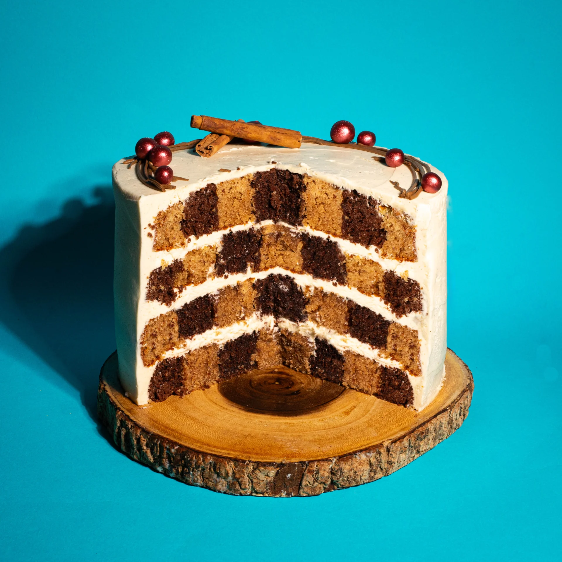 Here's a delicious cake that checks every box and goes heavy on the festive spirit! This banger from Chris uses two different sponges to create a checkerboard effect – a cake design that's bound to impress your guests when you cut the first slice. Expect notes of boozy eggnog, rich cocoa and bitter coffee, with a luxurious vanilla buttercream to round it all off. Merry Christmas!