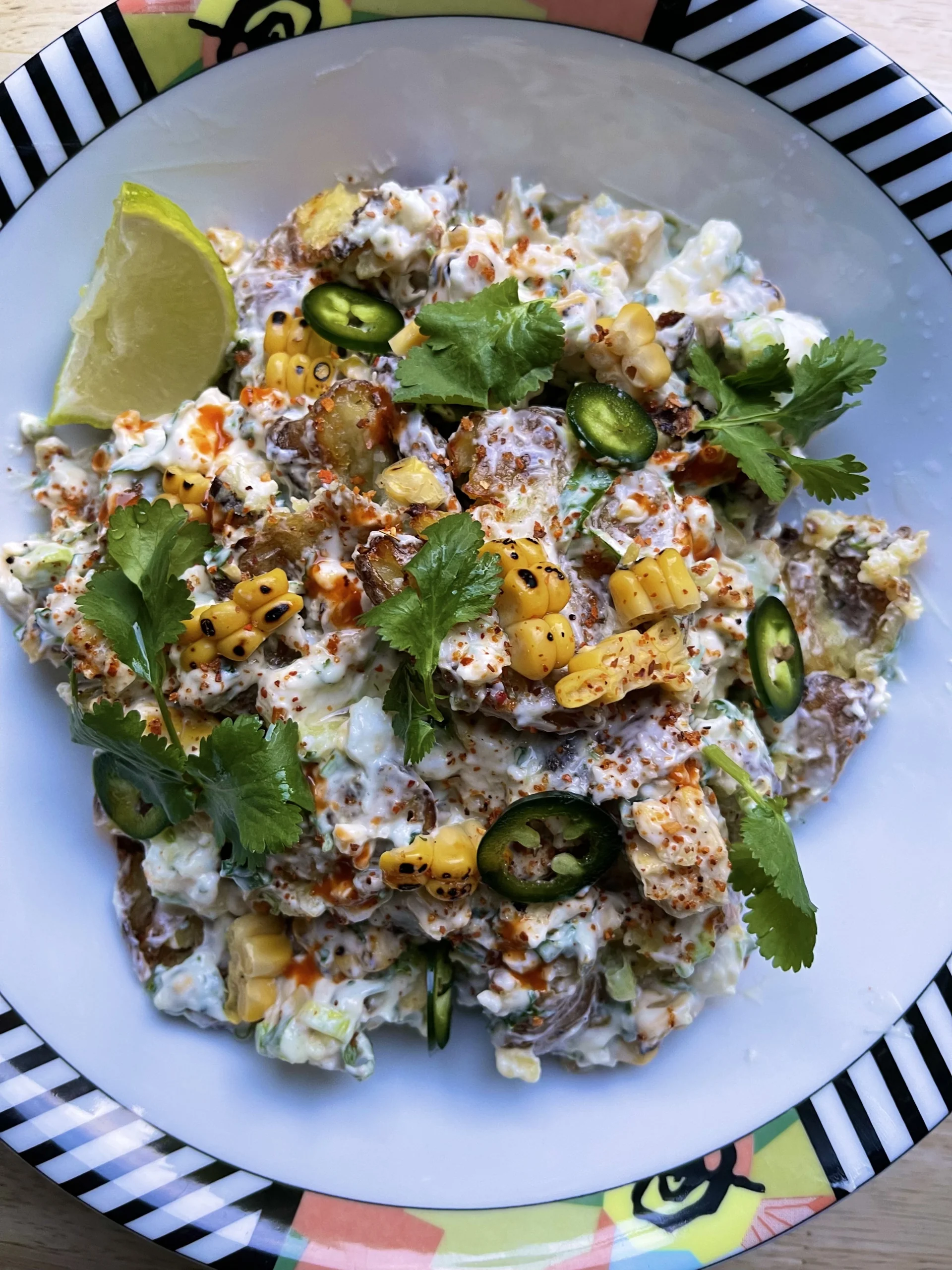 A creamy potato salad with sweet, charred corn and tonnes of fresh herbs, some zingy pickled jalapenos and a dash of hot sauce for good measure.