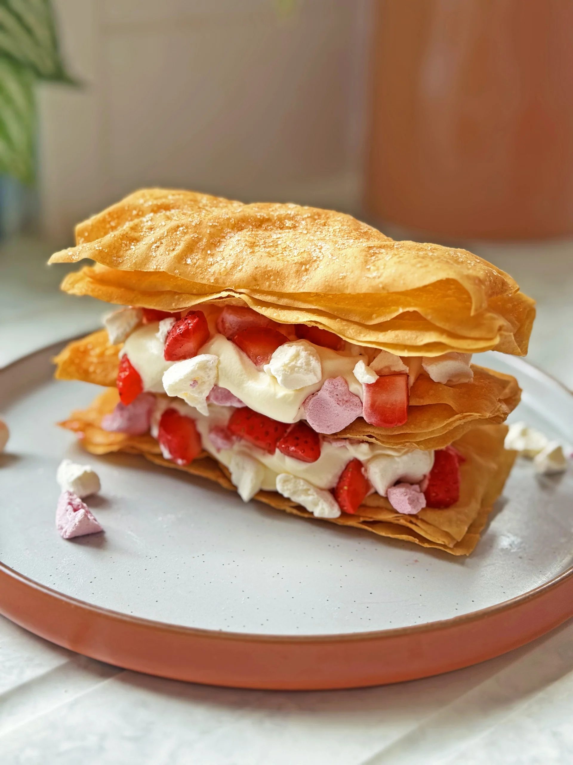 Once the filo rectangles are cooled, begin to stack. Spoon on some cream, sprinkle over chopped strawberries and crushed meringue then place on the next layer of filo. Usually 2 layers of filling and 3 layers of pastry.