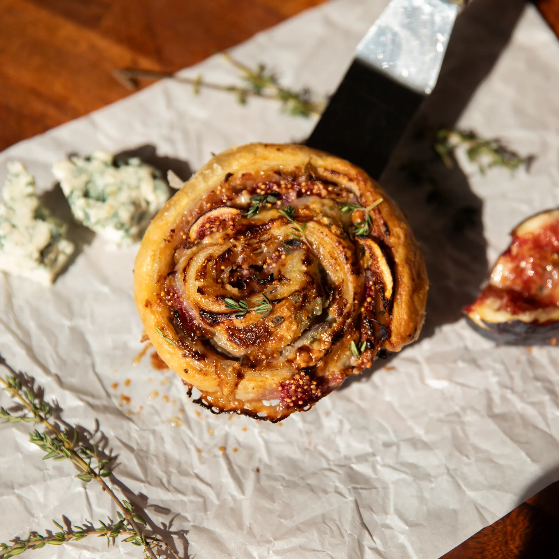 Sweet and savoury autumnal fig pastries, swirled with sweet fig jam, salty prosciutto, fresh figs, and creamy blue cheese, baked into golden, bite-sized pinwheels