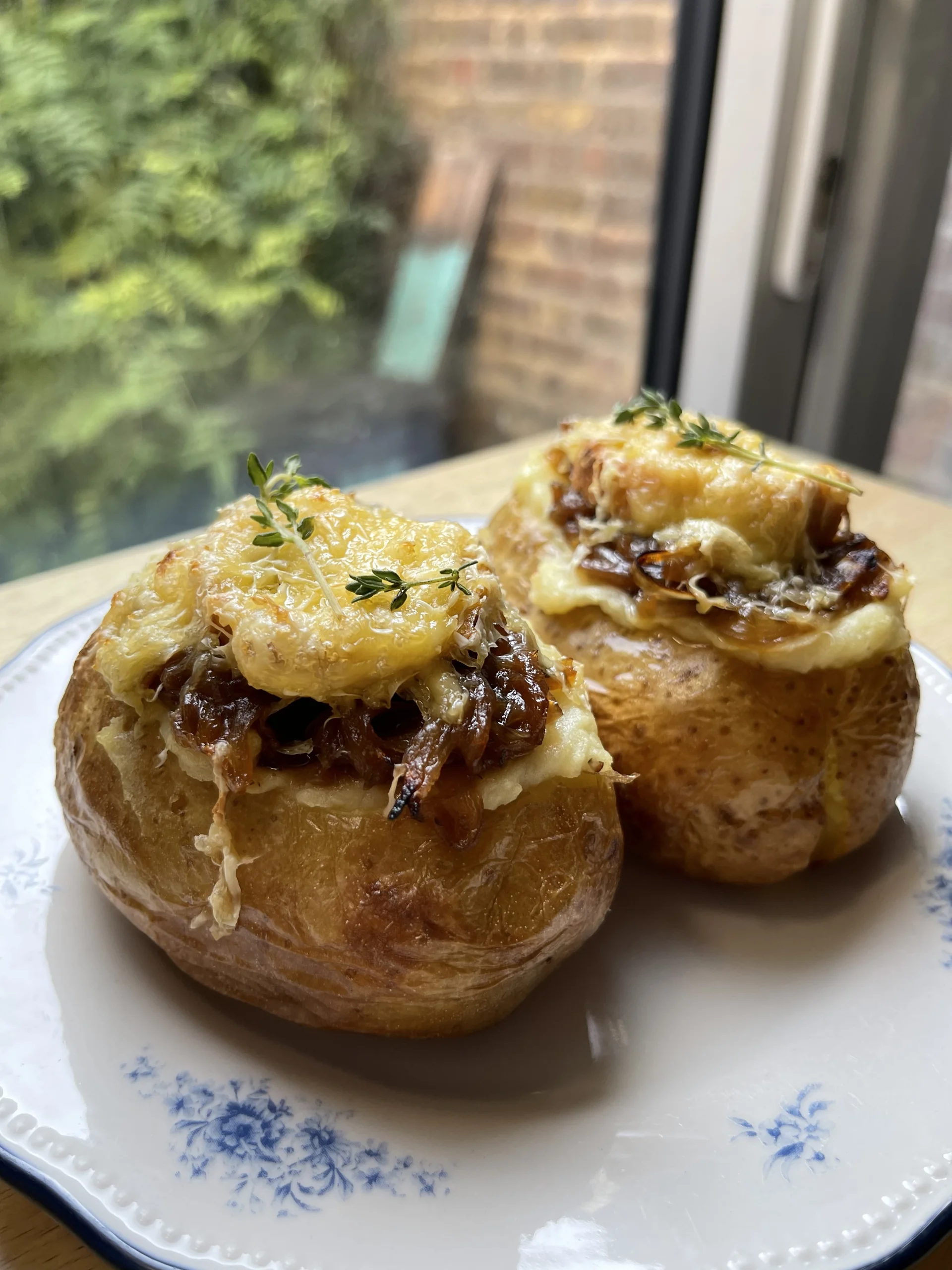Spoon the smooth potatoes back into the potato skins, with layers of caramelised onions and potato. Top with a slice of baguette, plenty of grated vegan cheddar and place back into the oven to melt the cheese. Dive in and enjoy.