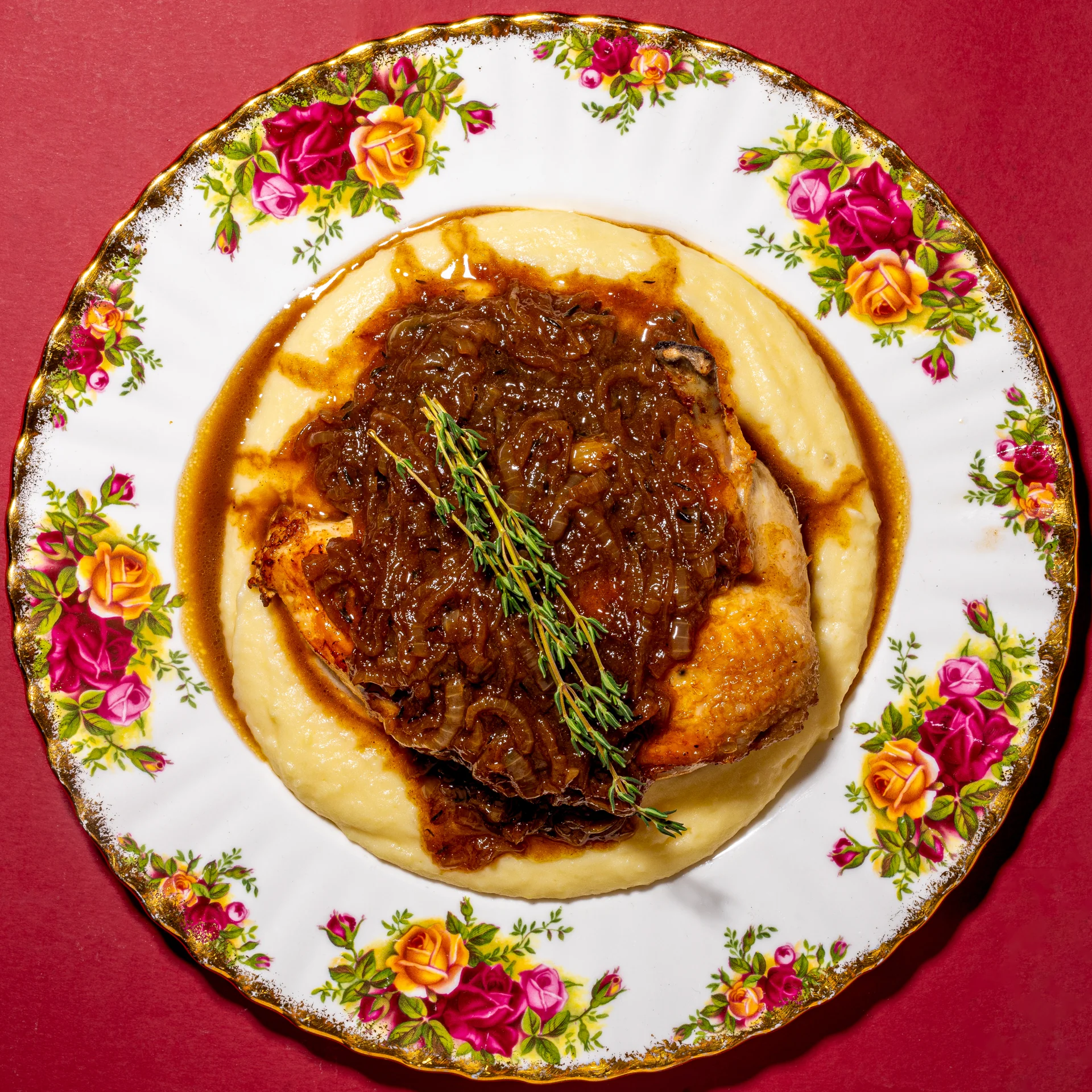 • To serve, spoon the mash onto a plate and top with the chicken. Spoon over the onion mixture and top with a sprig of fresh thyme.