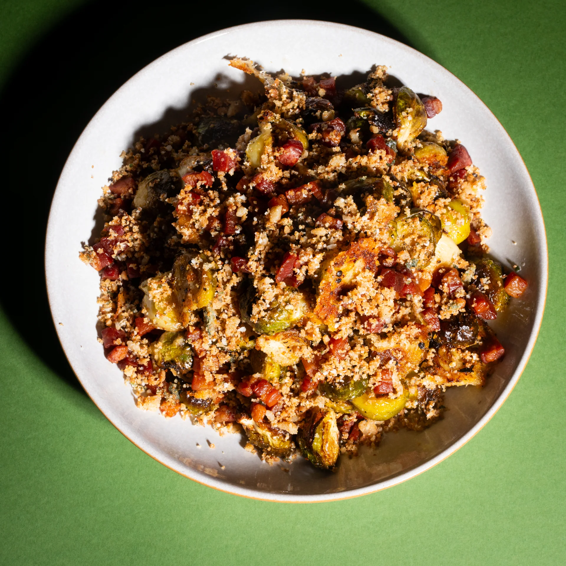 Break up the Brussels sprouts, add half to a serving bowl along with half the pancetta, then add the rest of the sprouts, more pancetta, and a few spoonfuls of the sage pangrattato.