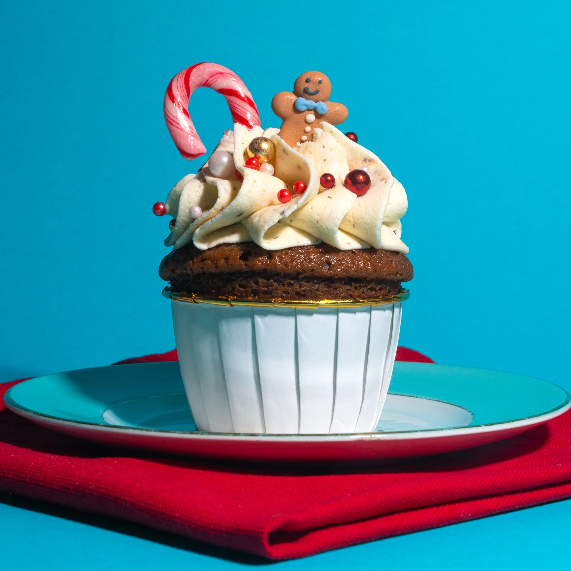 Pipe the buttercream onto the cupcakes with the piping tip of choice, and decorate with some gingerbread person toppers, and some sprinkles if desired!