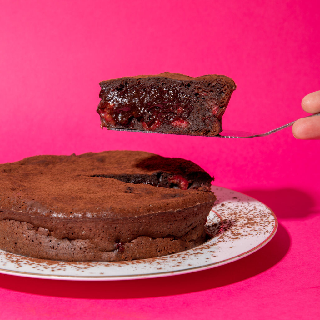 • Pour in the batter and bake for around 35 minutes, or until the top is set with a crust but the middle still has a pronounced wobble. Sprinkle with the remaining cocoa powder. Lovely!
