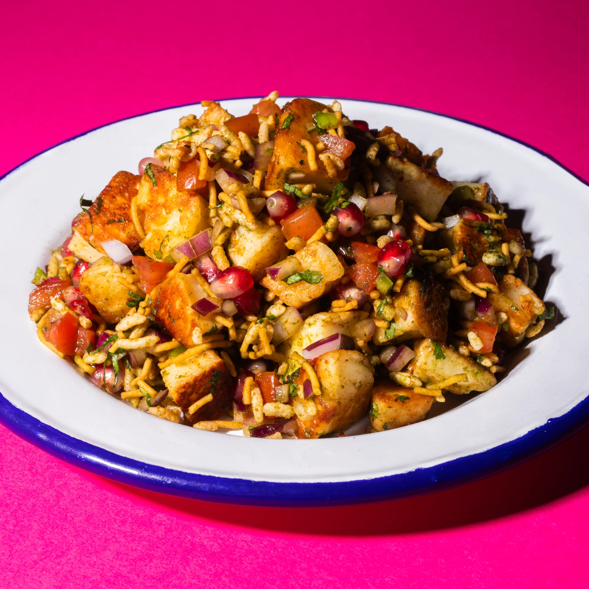 Inspired by bhel puri, an Indian chaat consisting of fresh veggies, chutneys and puffed rice called sev, this salad is the perfect combination of hot and cold, spicy and sweet! You'll often find paneer in chaat – which is an Indian cheese – but this time, Ori has thrown halloumi into the mix. Trust us, it works.