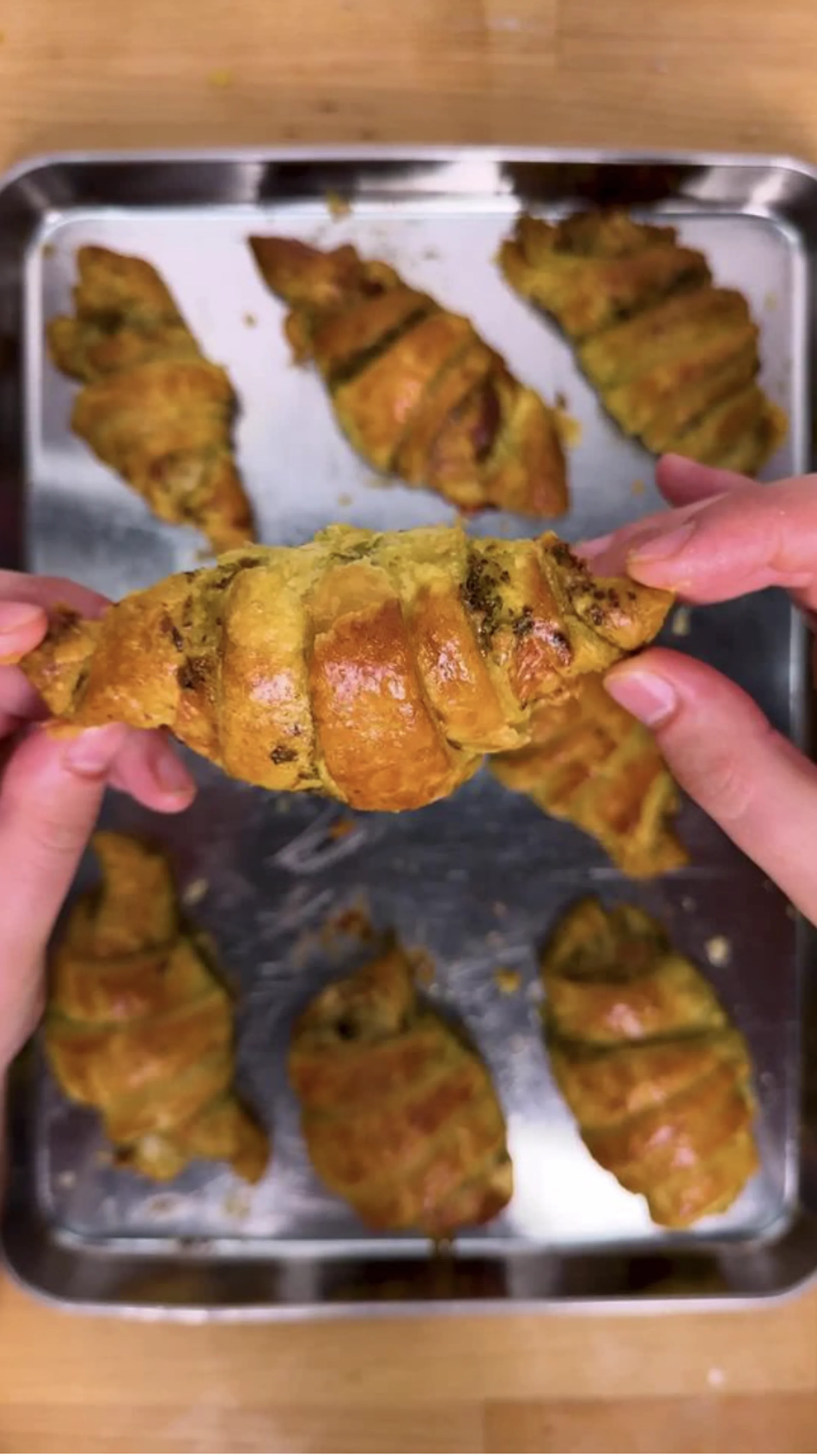Take the corners of the shortest side of each triangle and roll the dough into a croissant shape, making sure the filling is tucked into the first roll.