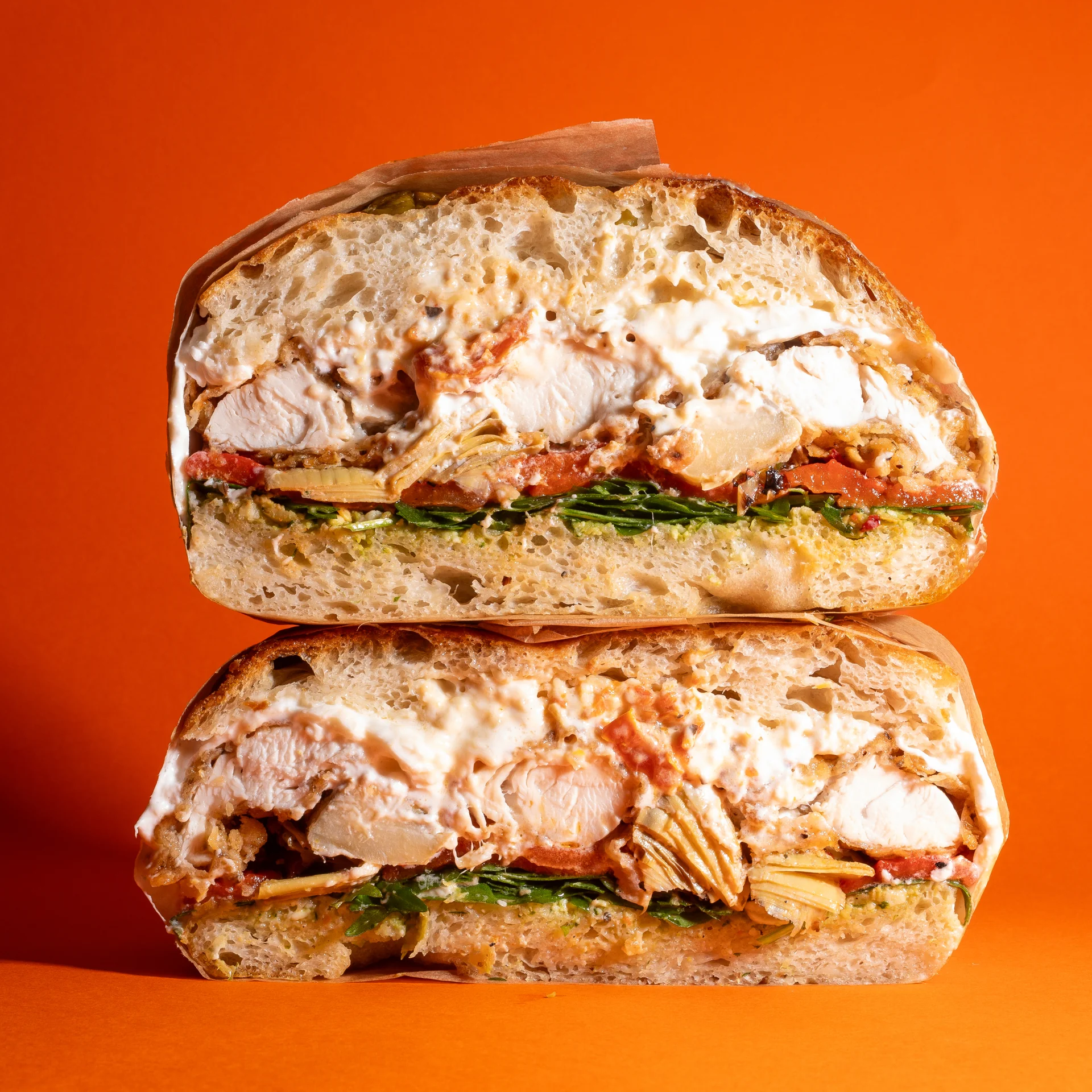 To build this beauty, start by lathering on that olive pesto, followed by rocket, sun dried tomatoes, roasted artichoke and red pepper. Add on those chicken tenders, and some burrata, and lather the top slice of focaccia with a lemon garlic mayo, made simply by grating lemon zest, and mashing roast garlic into mayonnaise.