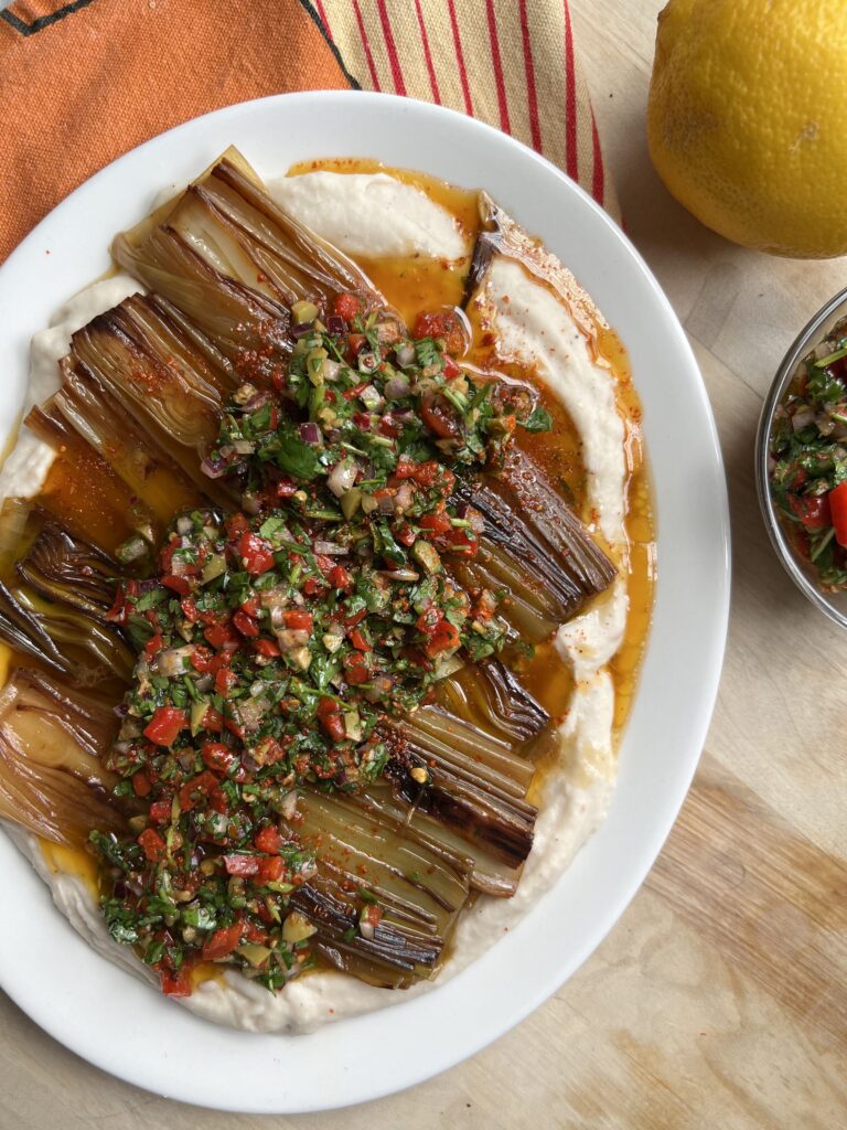 Soft leeks with a smooth bean mash and a vibrant olive and red pepper chimichurri – the perfect spring or summer dish to bring to any occasion.