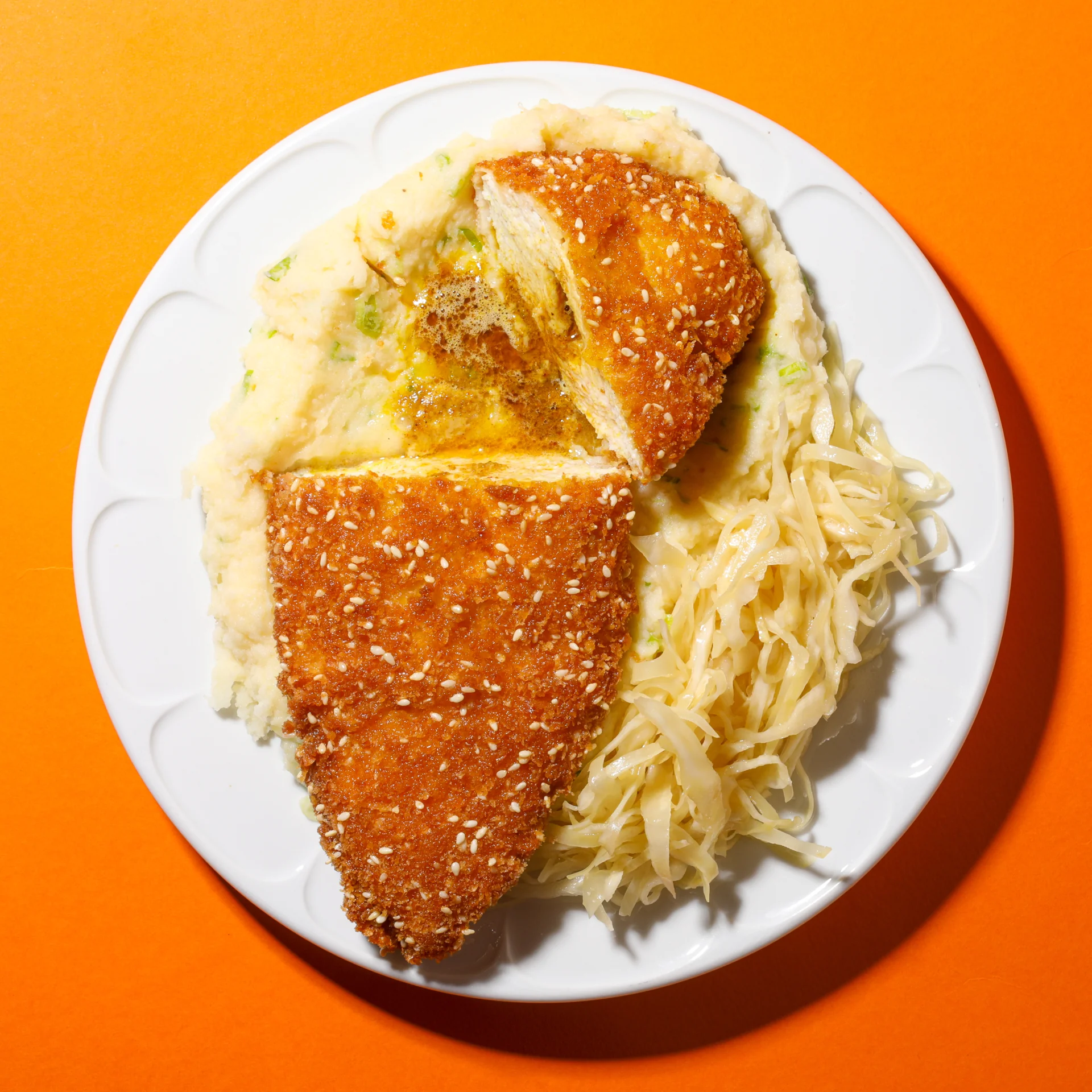 To serve, add a large spoon of the miso mash onto the side of a plate, followed by the salad, and layer on that Kiev. All that's left to do is enjoy!