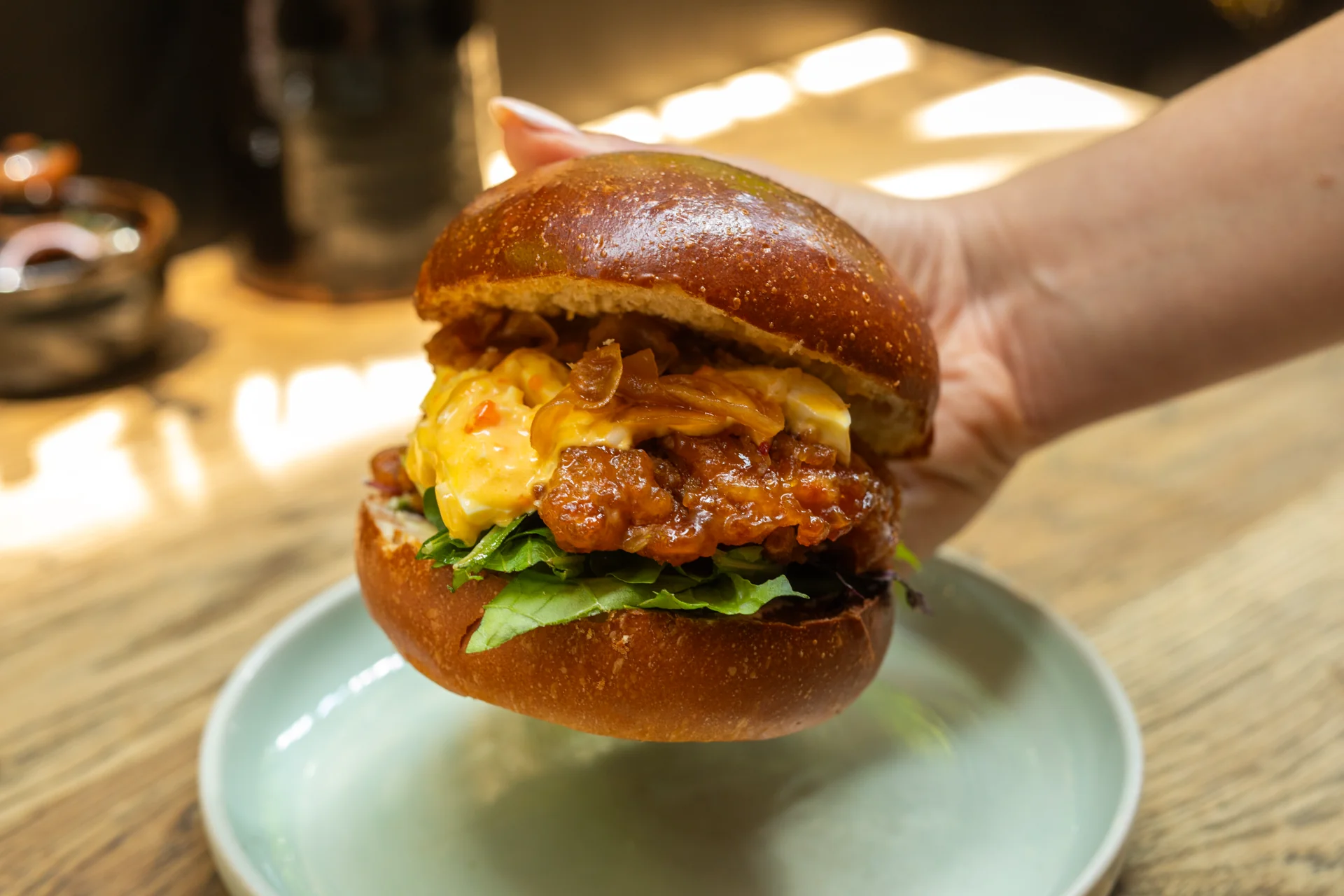 Toast and butter your bun, then build the sandwich with a handful of salad leaves, the Nanban chicken, the egg tartare, and finish with a spoonful of Fukujinzuke on top.