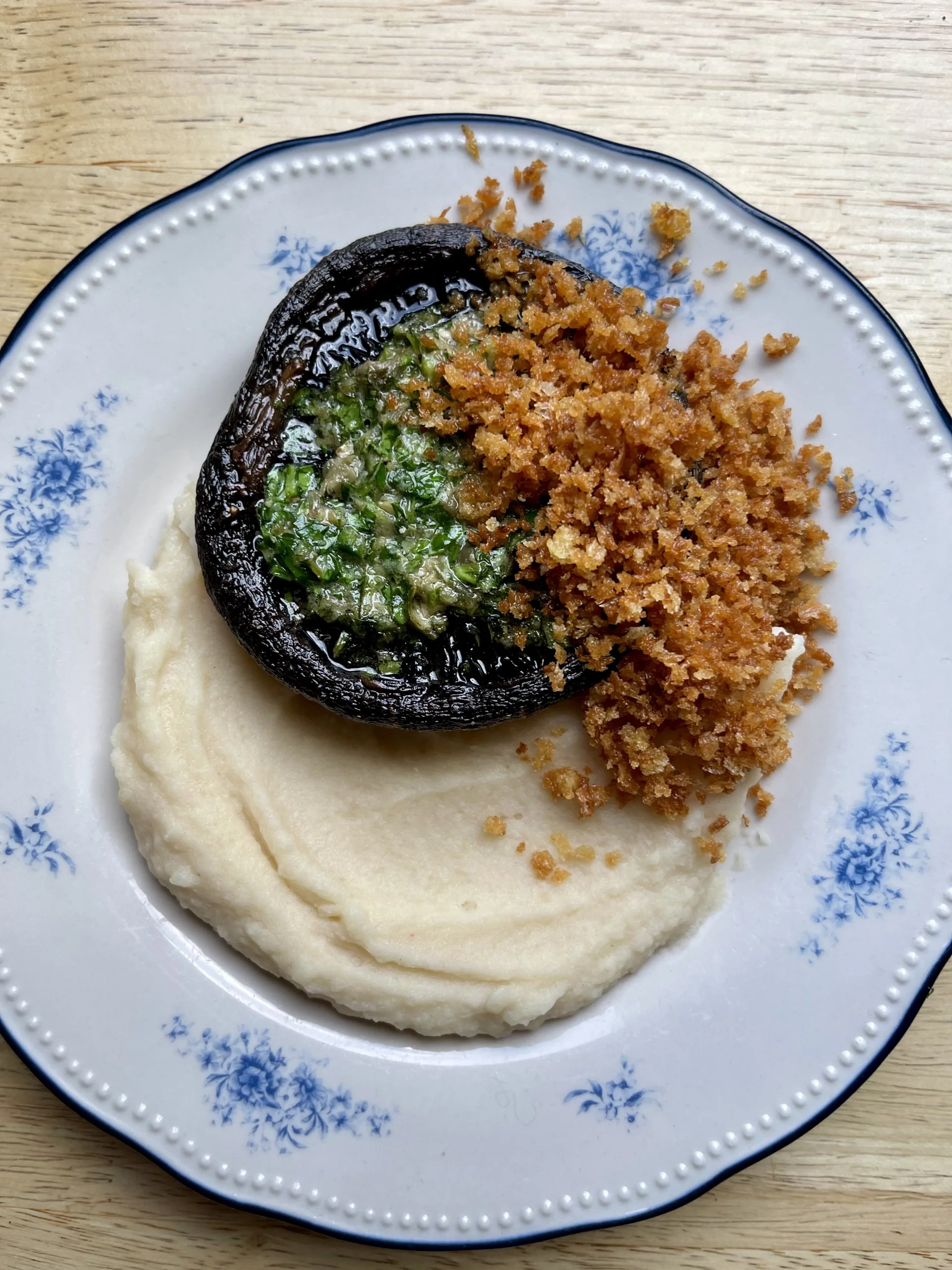 Add salt, pepper and lemon zest to the breadcrumbs then assemble everything. Generously dollop some mash onto the plate followed by the mushrooms, and a generously helping of breadcrumbs. Enjoy!