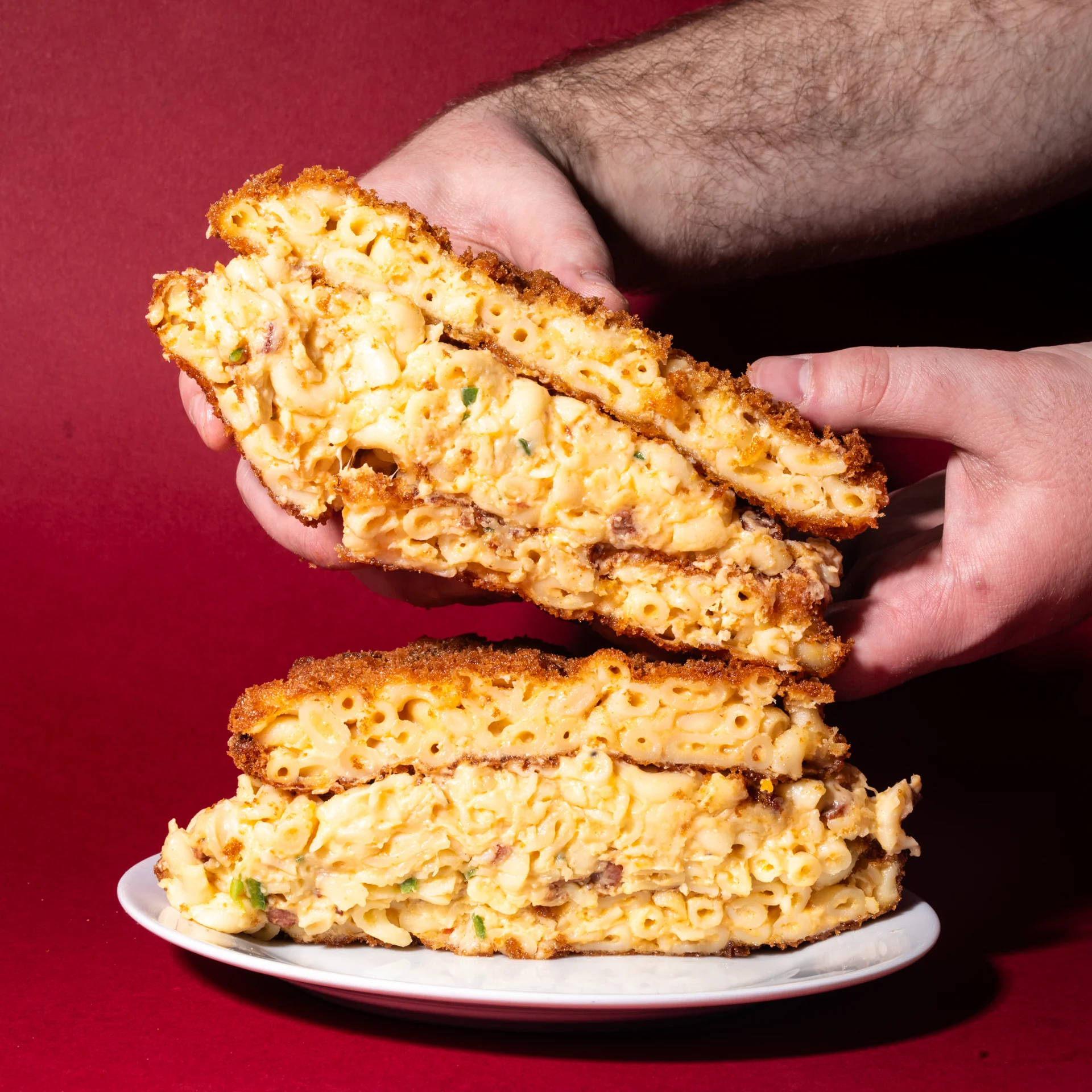 Its a grilled cheese, but we've gotten ride of the bread, and replaced it with mac and cheese, and filled it with even more mac and cheese, but with bacon and jalapeños, to make this a mac and cheese lover's dream!