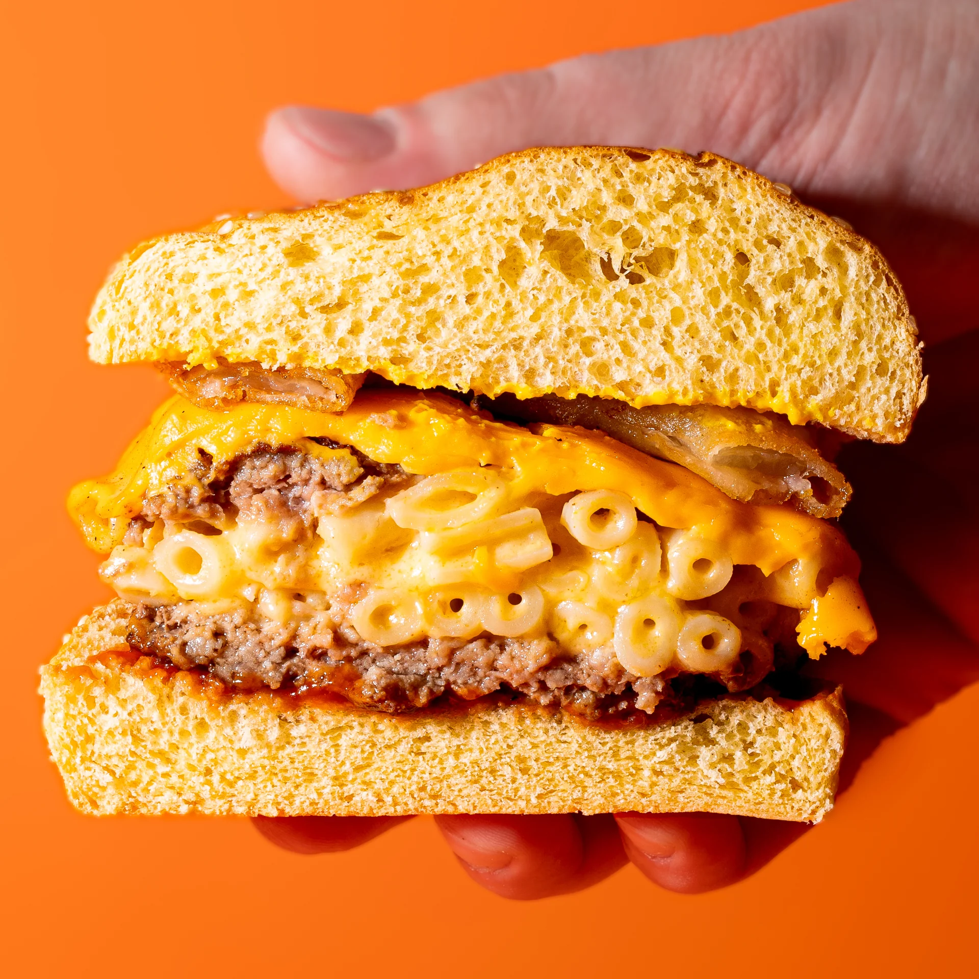 We've done what everyone has been thinking. A gorgeous fatty beef patty, stuffed with our best Mac and cheese, topped with sliced cheese, and homemade fluffy onion rings... because food is for enjoying!