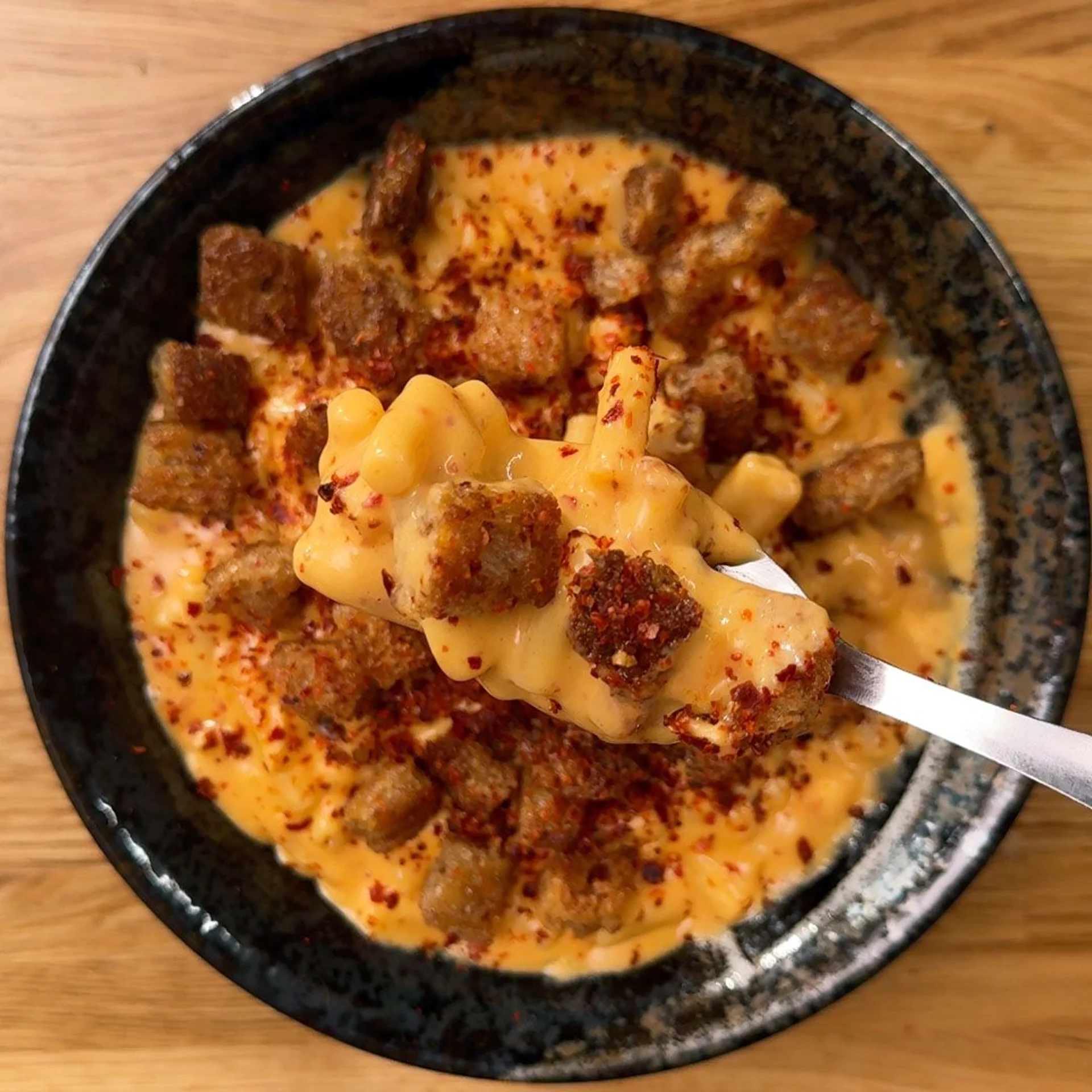 A play on two classic dishes, kimcheese and mac n cheese, this dish uses the funky, tangy kimchi to devastating effect.