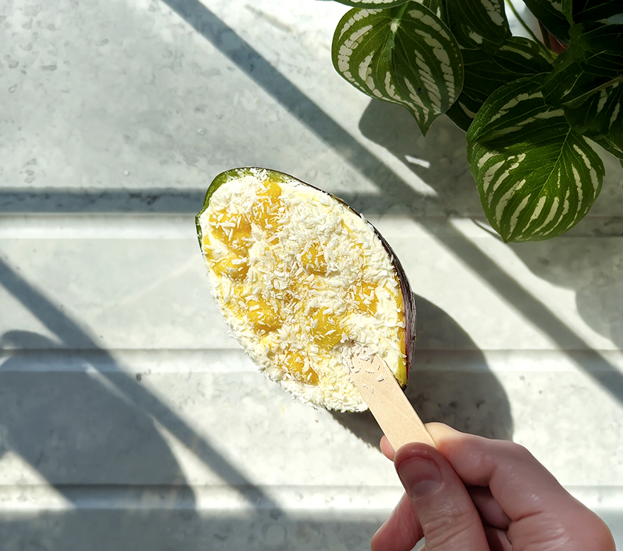 Stick in a thick wooden stick, add in some mango pieces and sprinkle with dessicated coconut. Then freeze for at least 6 hours.
