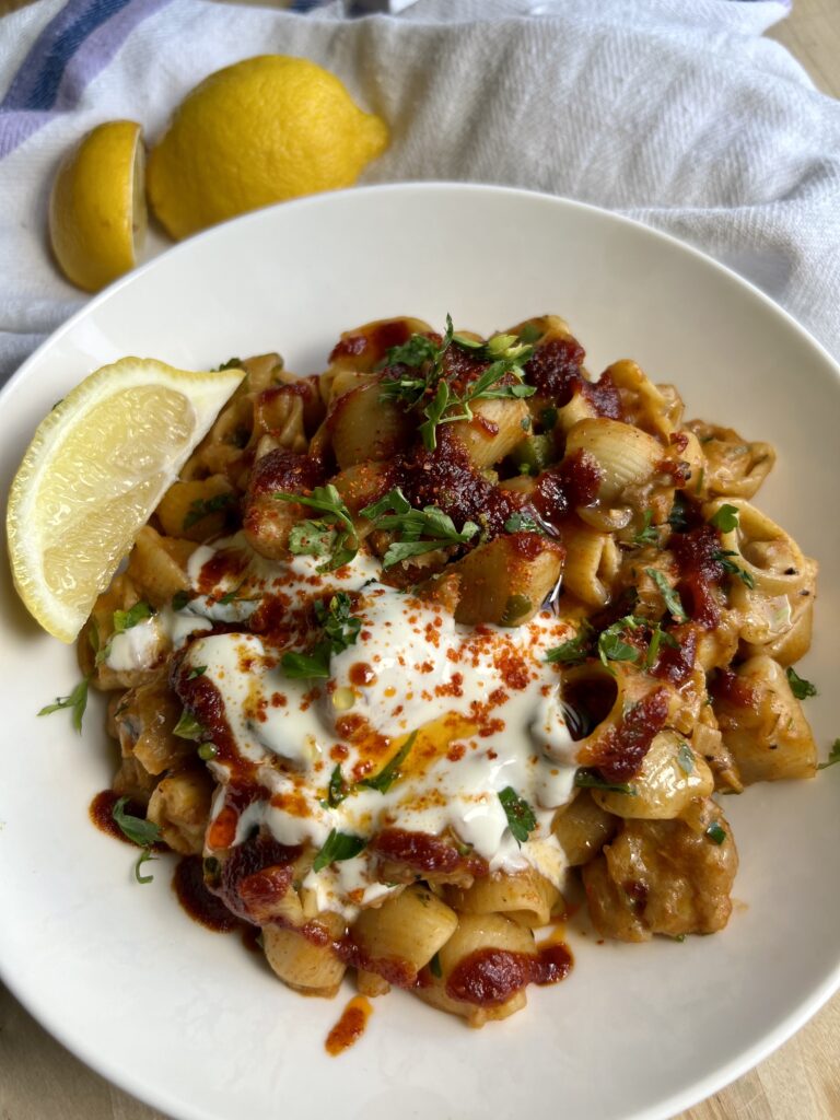 Once the pasta is cooked add the fresh parsley, a squeeze of lemon and season to taste. Serve up with a dollop of garlic yoghurt and a generous drizzle of the pul biber butter.