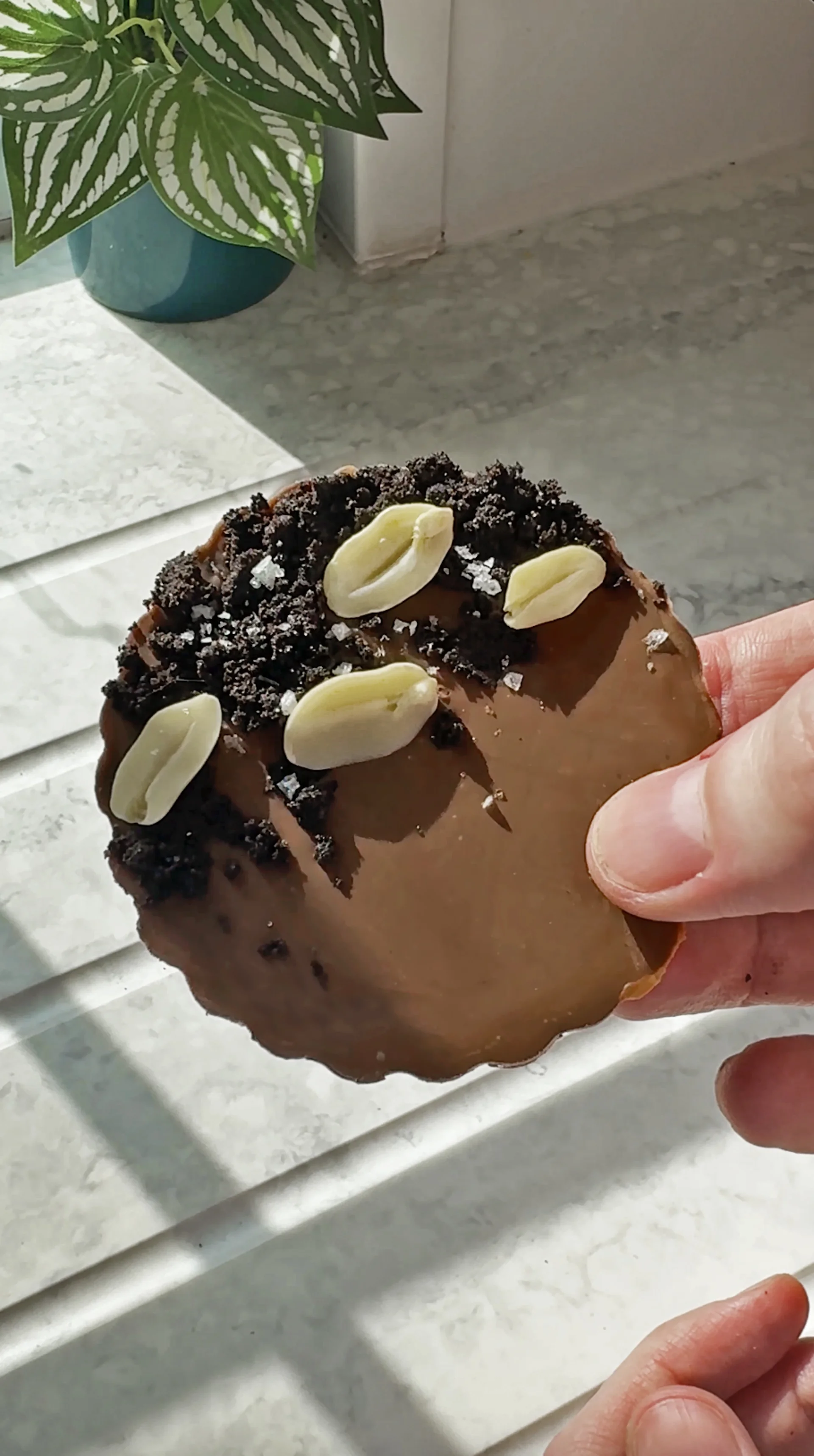 Seal the cups with the final layer of milk chocolate on top sprinkle over cookie crumbs add a couple of peanuts and a sprinkle of sea salt.