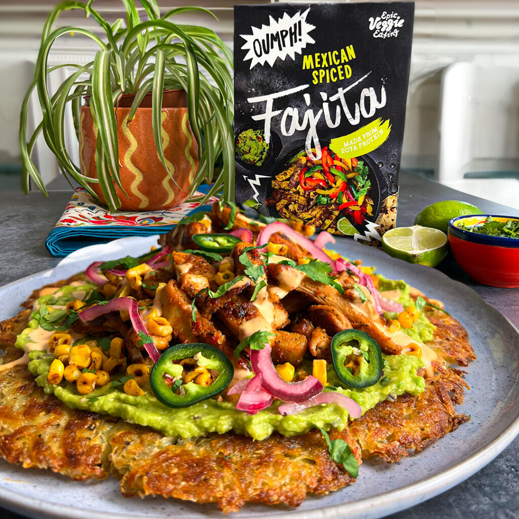 We’ve yet to meet a person who doesn’t like hash browns. They’re like tiny little chips all neatly layered together in one big crispy parcel. This one is loaded up with tonnes of delicious toppings, but most importantly some Oumph! Mexican Spiced Fajita strips. RUN don’t walk to Iceland or Tesco to get your mitts on some, they seriously level up any dish.