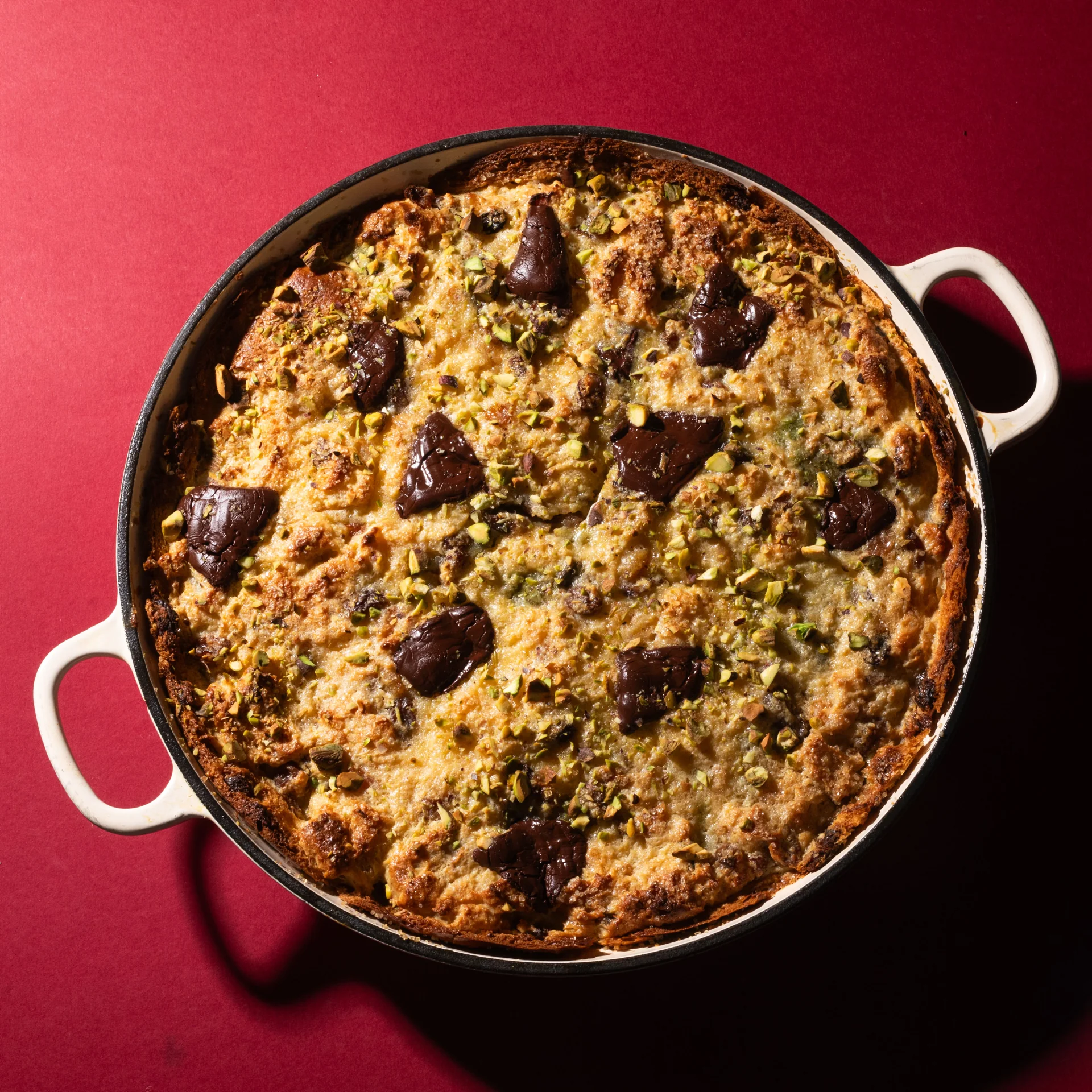 Spoon half of the panettone mixture into the dish. Sprinkle over chunks of chocolate, blobs of pistachio cream, and chopped pistachios.
