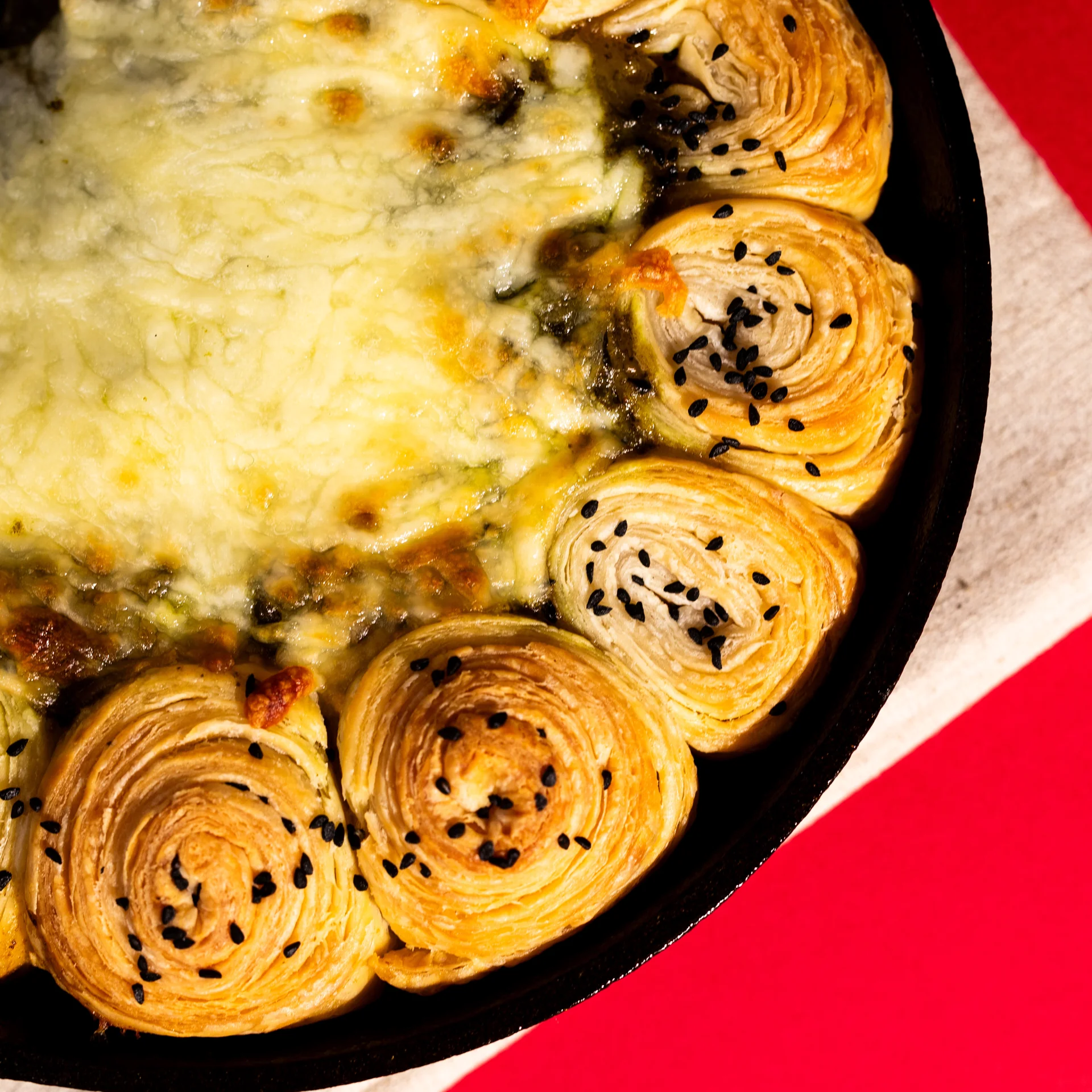 Arrange around the skillet. Fill the middle with the saag dip. Brush the paratha with egg wash and sprinkle with nigella seeds. Bake for 20 minutes.