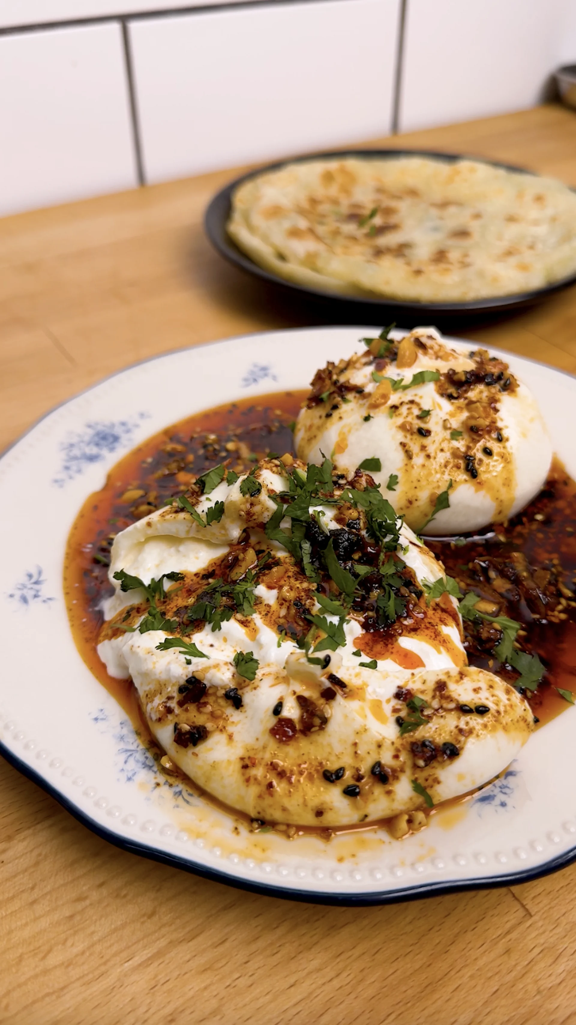 For chilli crisp burrata, score the top of each burrata and use a knife and fork to gently reveal the molten centre. Spoon over a generous amount of the chilli crisp oil, garnish with fresh herbs and enjoy with scallion pancakes or flaky paratha.
