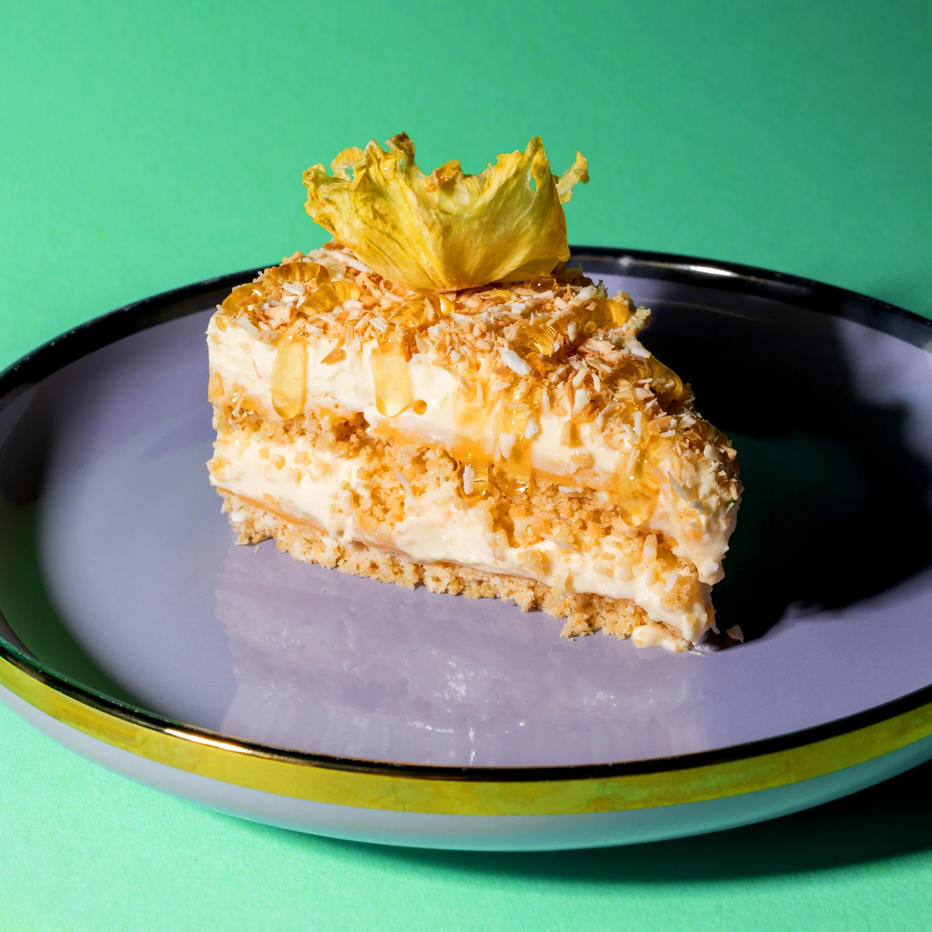 Here's a creamy cake that will take you right to the beach. Coconut biscuit base and a fresh pineapple custard, all underneath a lime spiked custardy cream topped with toasted desiccated coconut.