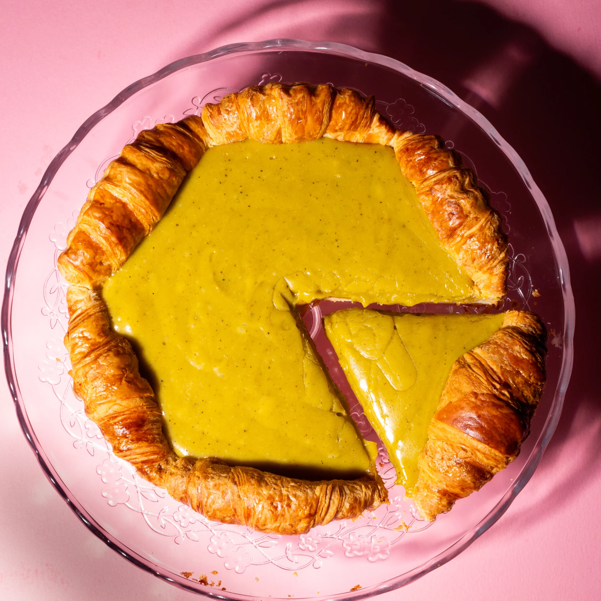 Pour this into your (cooled) croissant base. Let it set in the fridge for around 2 hours, then scatter with pistachio nuts and eat.